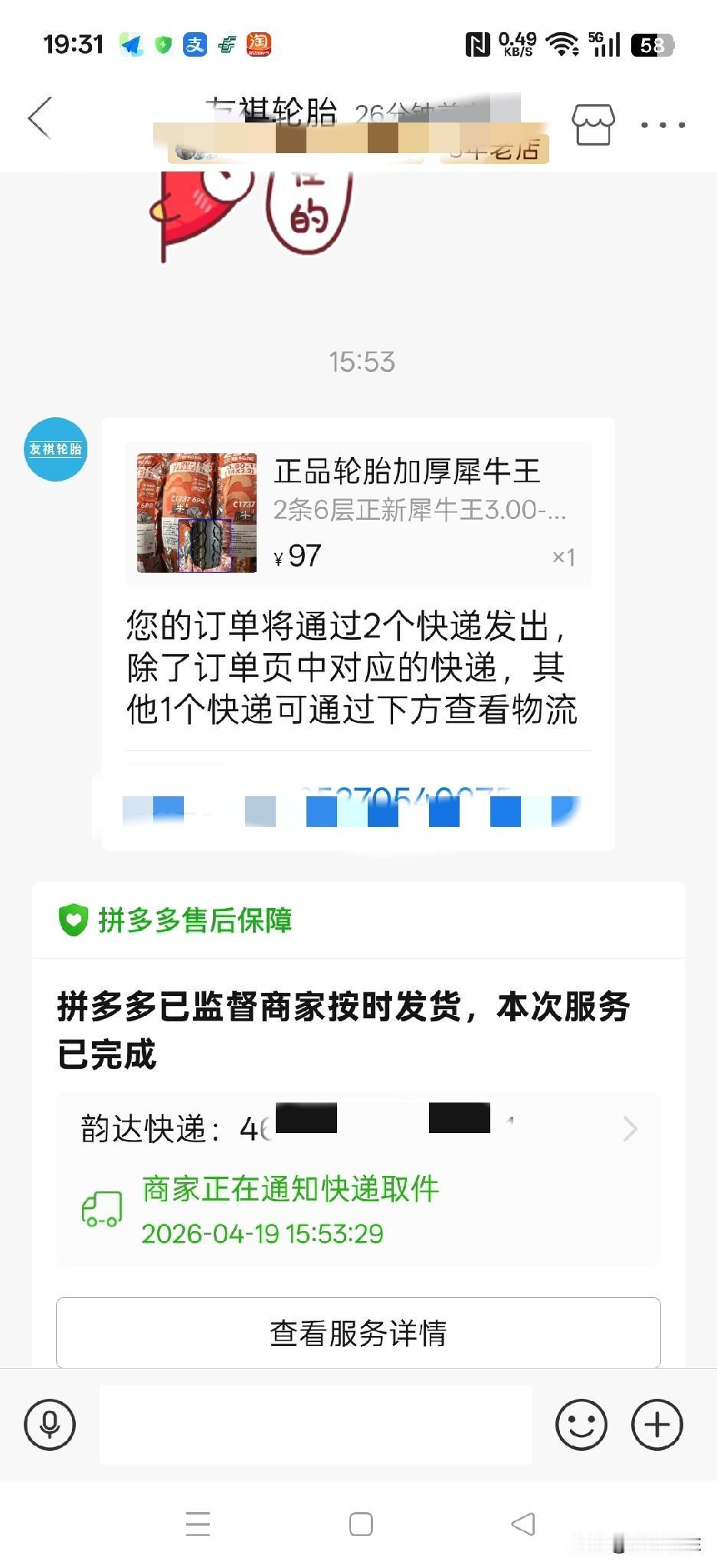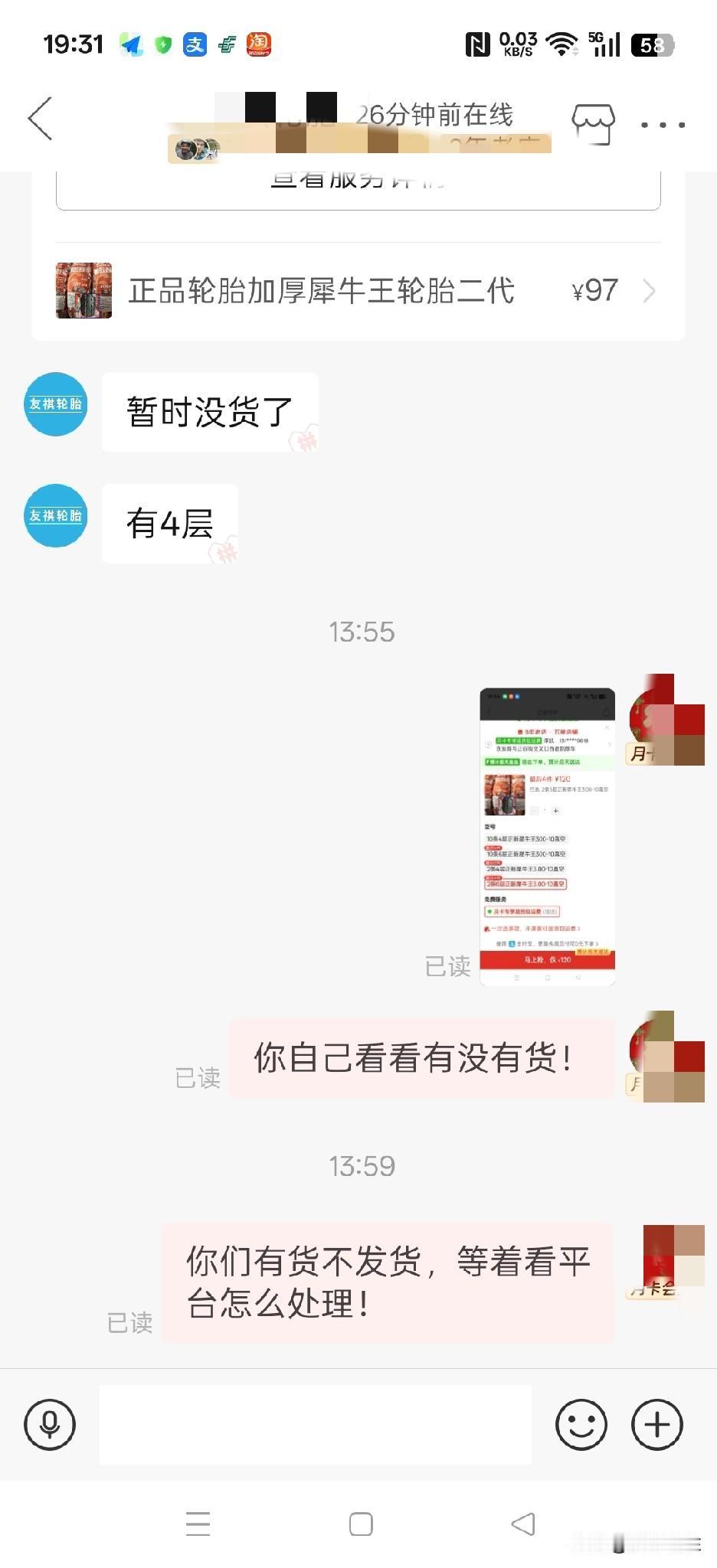 电动车轮胎用了三年了,比较了几家购物平台,同样的品牌和规格,还是拼多多价格最实惠。昨天早晨就下单了,昨天没有发货,今天中午联系商家客服,没有回应,要求平台介入督促商家发货,下午再联系商家,商家说没货了,轮胎有4层的没有6层的了,可是我查了商家的页面,显示还是有货的,我就不明白商家有货为什么不发了,难道是轮胎涨价了?在拼多多平台的监督下,商家在傍晚货了。
