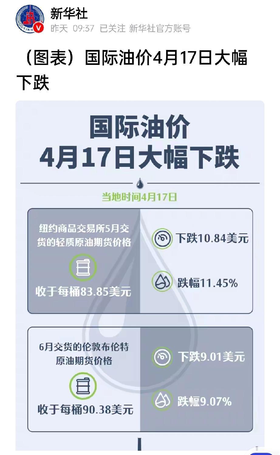 1、4月17日:美伊达成临时停火,霍尔木兹海峡对商船开放,国际油价应声暴跌,WTI原油跌至83.85美元/桶(跌幅11.45%),布伦特原油跌至90.38美元/桶(跌幅9.07%)。