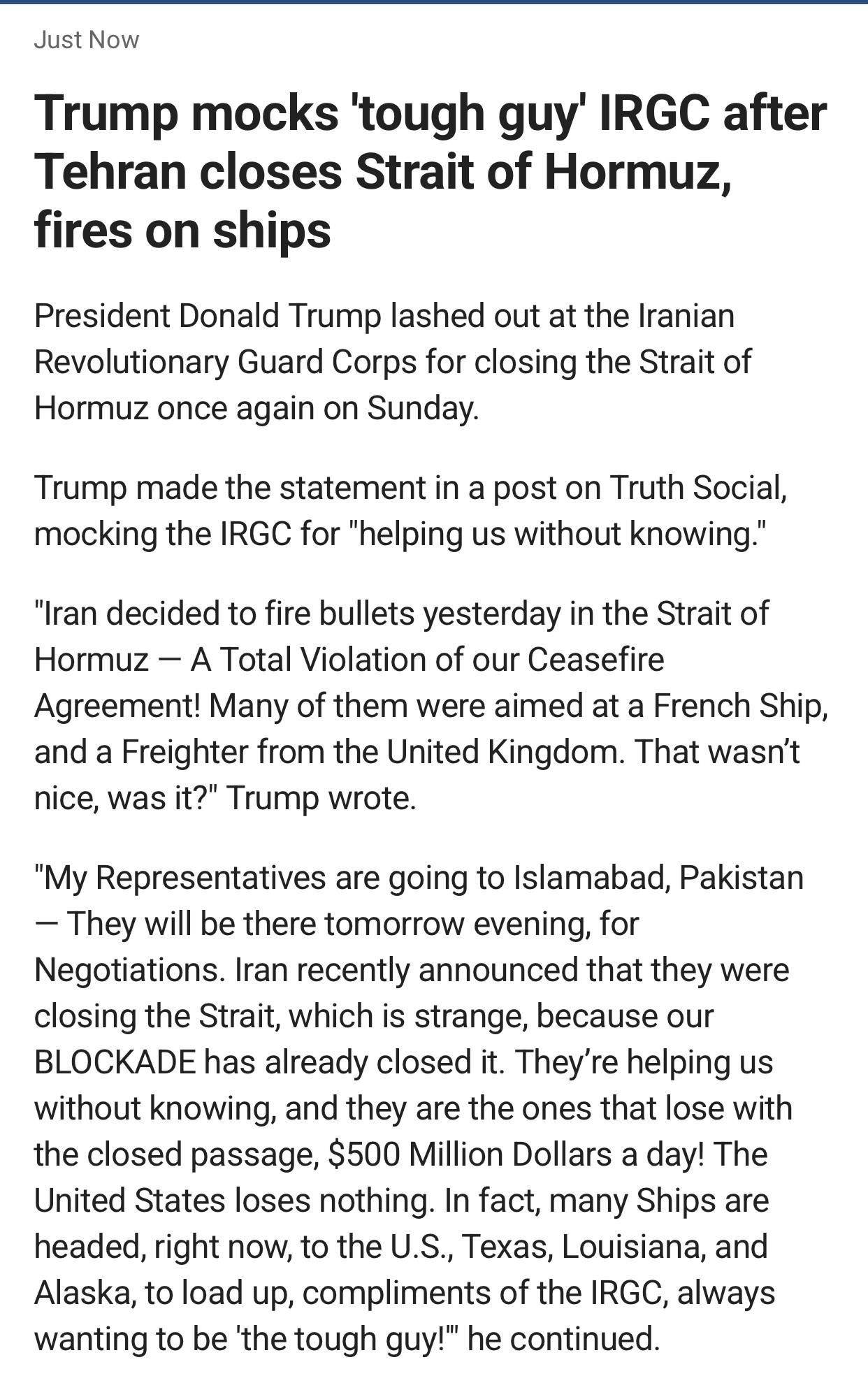 “我的代表们会前往巴基斯坦伊斯兰堡——他们将于明晚抵达,进行谈判。伊朗最近宣布他们封锁海峡,这很奇怪,因为我们的封锁已经把他们封锁了。他们正在不知不觉中帮助我们,而他们正是因航道关闭而每天损失5亿美元的人!美国什么损失都没有。事实上,许多船现在正驶向美国,前往德克萨斯州、路易斯安那州和阿拉斯加,在伊斯兰革命卫队的帮助下装货,他们总是想成为‘硬汉’!”他继续说道。