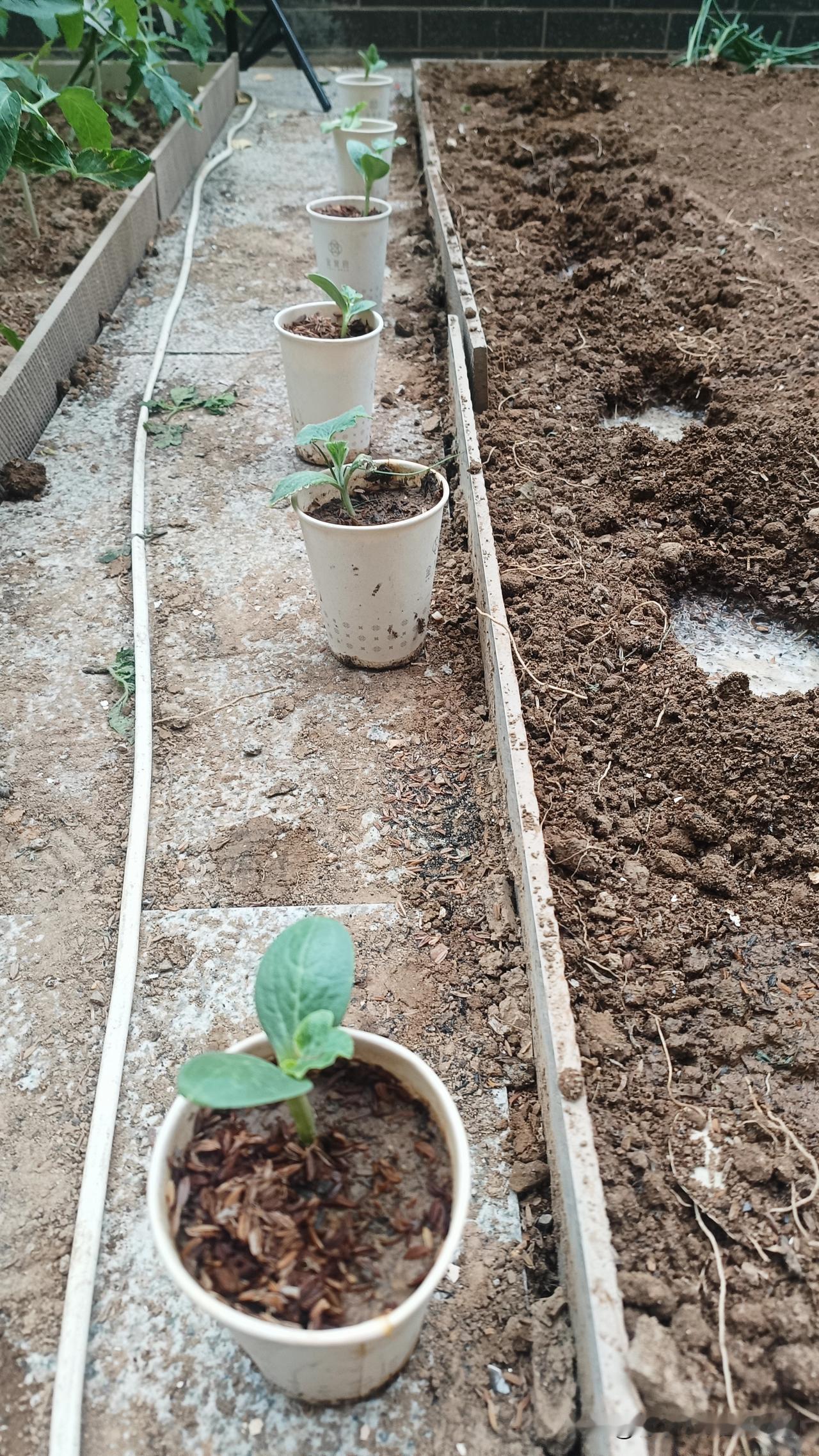 正赶上种西瓜的好时候,先把地里的蒜苗清了,晚上蒜苗炒肉,热菜也有着落!拔完蒜苗,羊粪、稻壳炭、腐熟稻壳、草木灰、枯草芽孢杆菌全安排上,翻地搂平,按30公分株距挖坑浇水,把自己育的西瓜苗移栽到位。