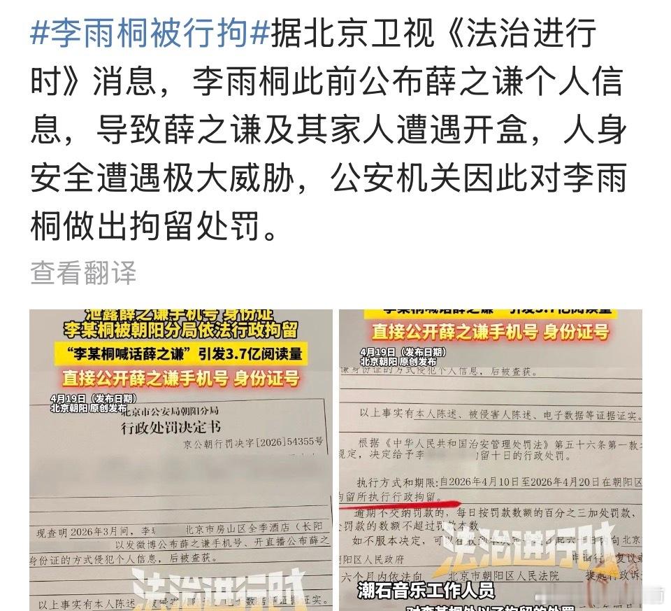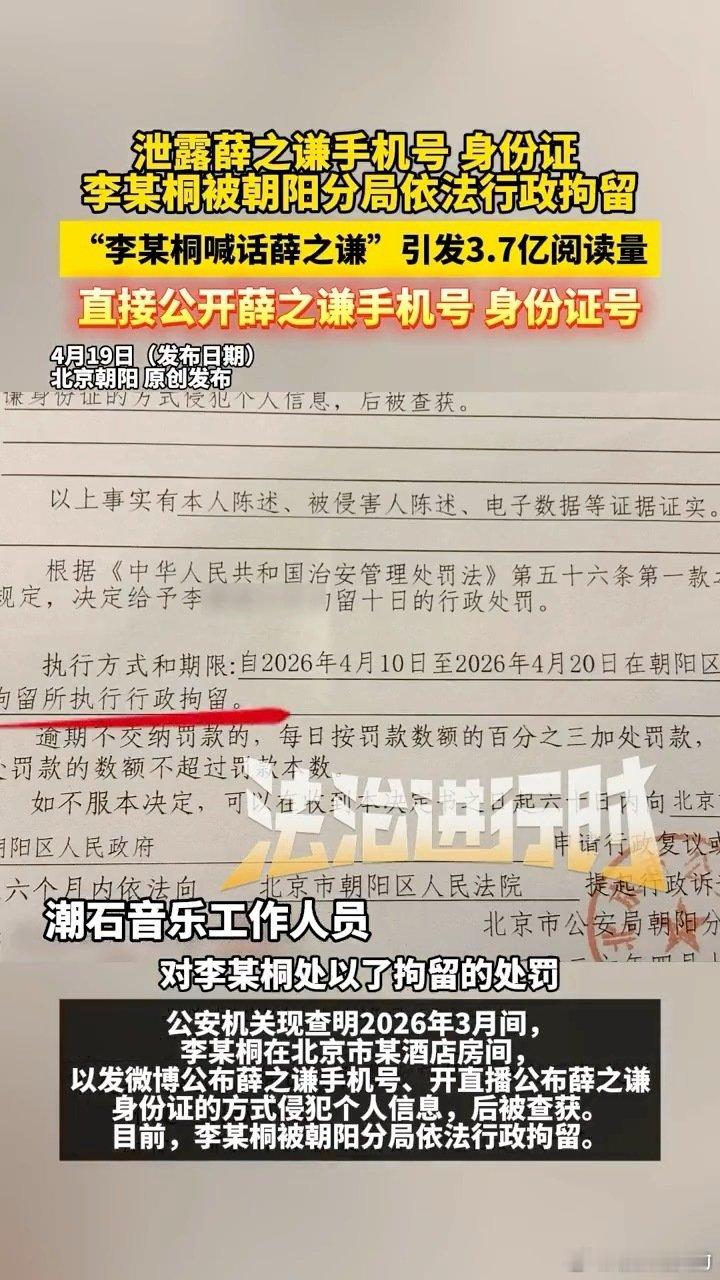 因为泄漏薛之谦个人信息,李雨桐被行拘了