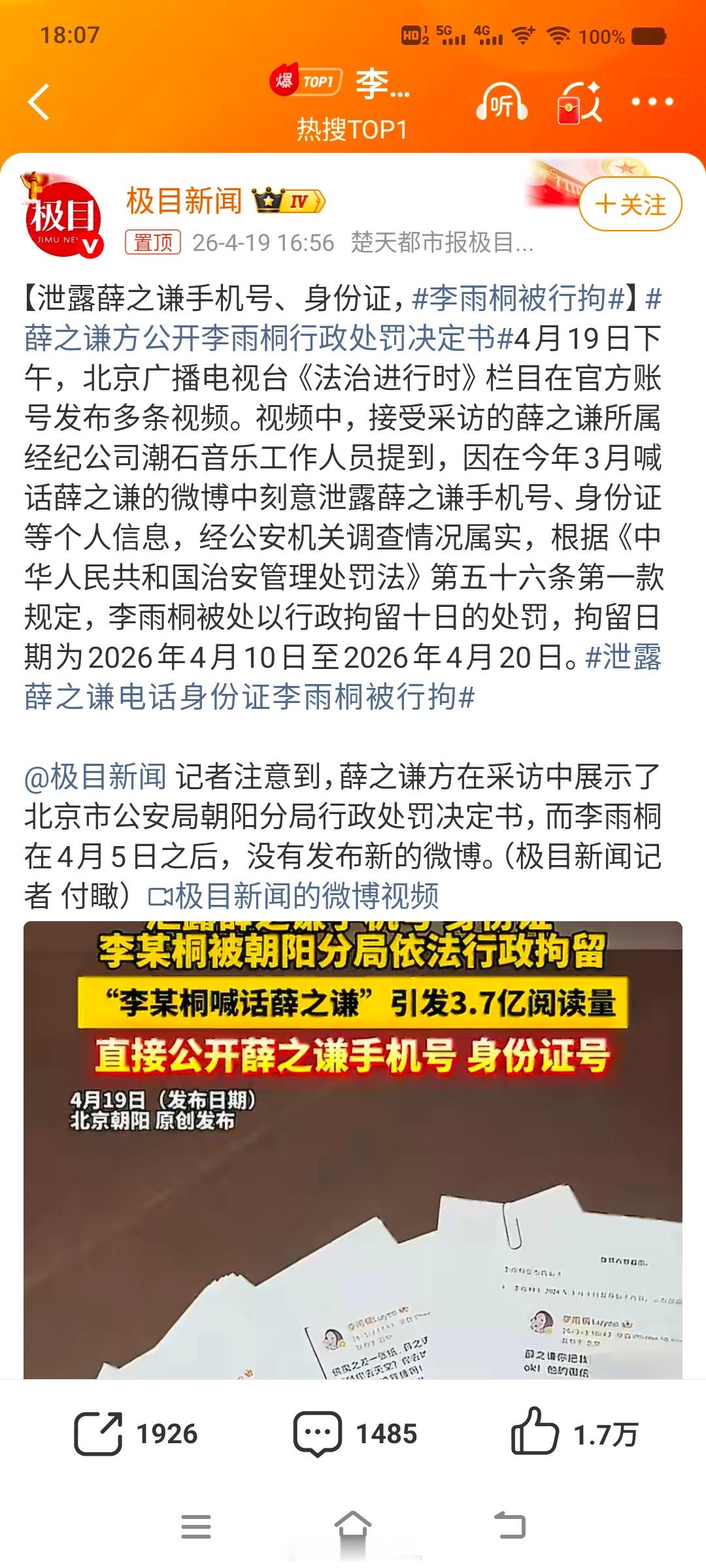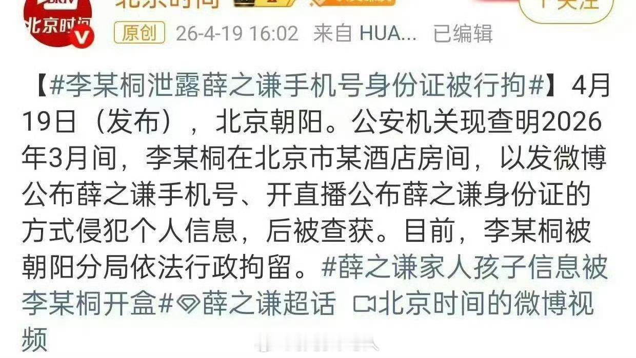 李雨桐被行拘十年恩怨终由法律定性。无论旧怨多少,曝光他人隐私已明显越界。李雨桐薛之谦时间线:•2017:薛之谦与高磊鑫复合,李雨桐发文控诉。•2018–2024:双方多次互诉名誉权、合同纠纷,均无司法定论。•2025:李雨桐直播官宣和解,赞薛之谦“人好”为薛之谦新歌宣传。•2026.3:旧事重提引发热议。•2026.4.19:李雨桐因泄露薛之谦手机号等隐私被行拘薛之谦方公开李雨桐行政处罚决定书