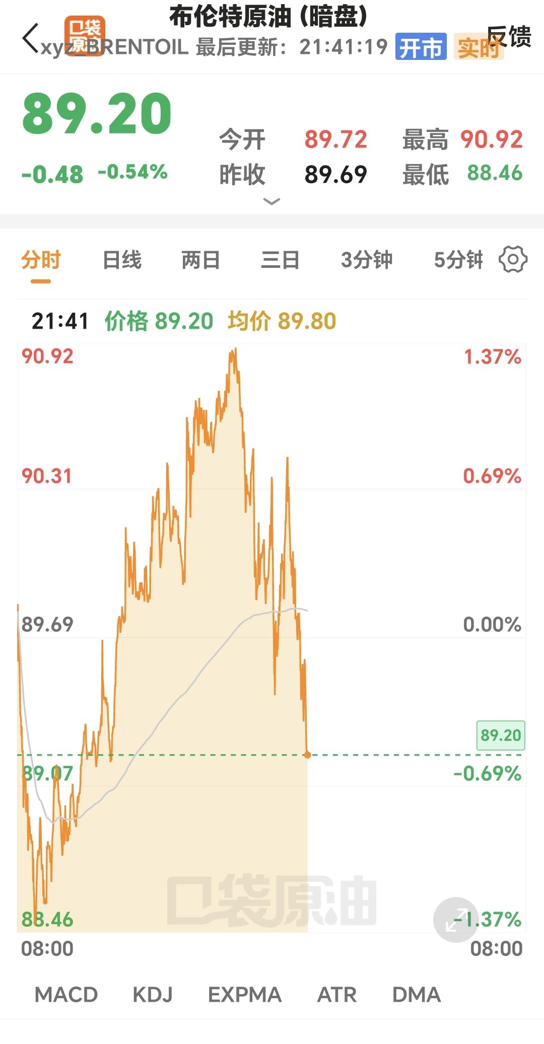 布伦特原油暗盘下跌了0.54%,报于89.20%,说明是利好消息。