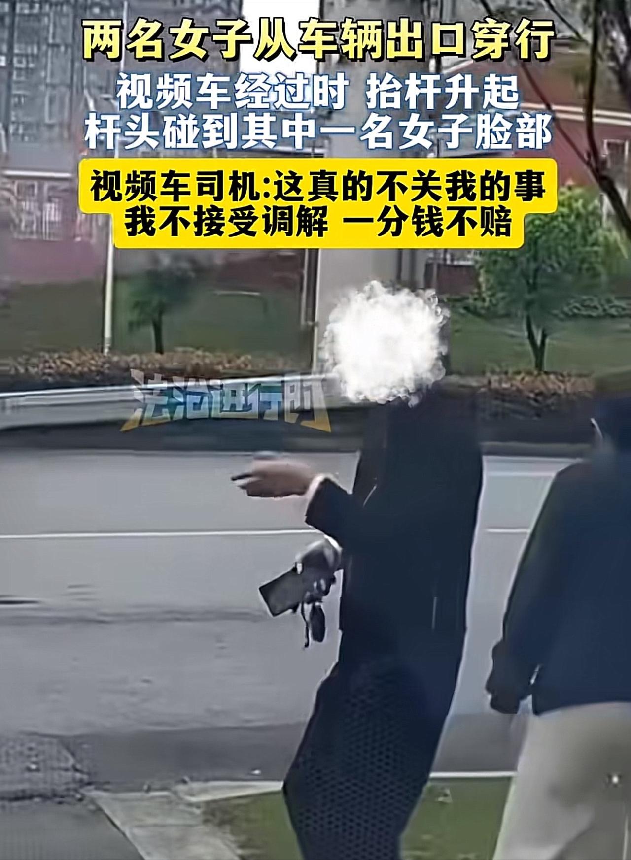 当时手扶道闸杆的女子,正低头和同伴交谈,完全没注意到道闸杆的动静,等到察觉时,道闸杆已经升到了她的脸部位置,来不及躲闪,脸颊被道闸杆狠狠刮到,一阵剧痛传来。