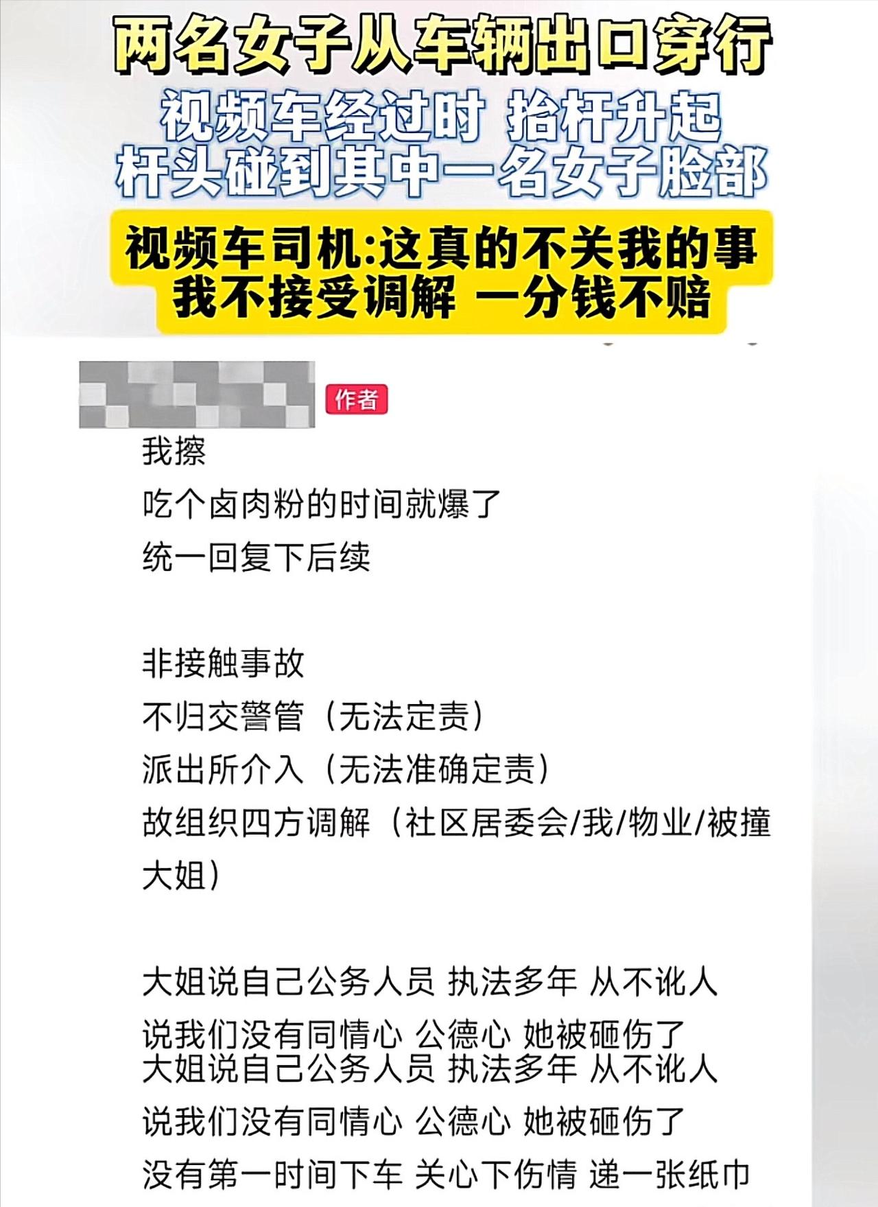 可业主听完后,当场就拒绝了,语气坚决地表示,自己根本没有过错,车子压根没碰到女子,道闸杆是自动识别后升起的,他已经刻意放慢车速避让,责任不在自己,一分钱都不会赔。