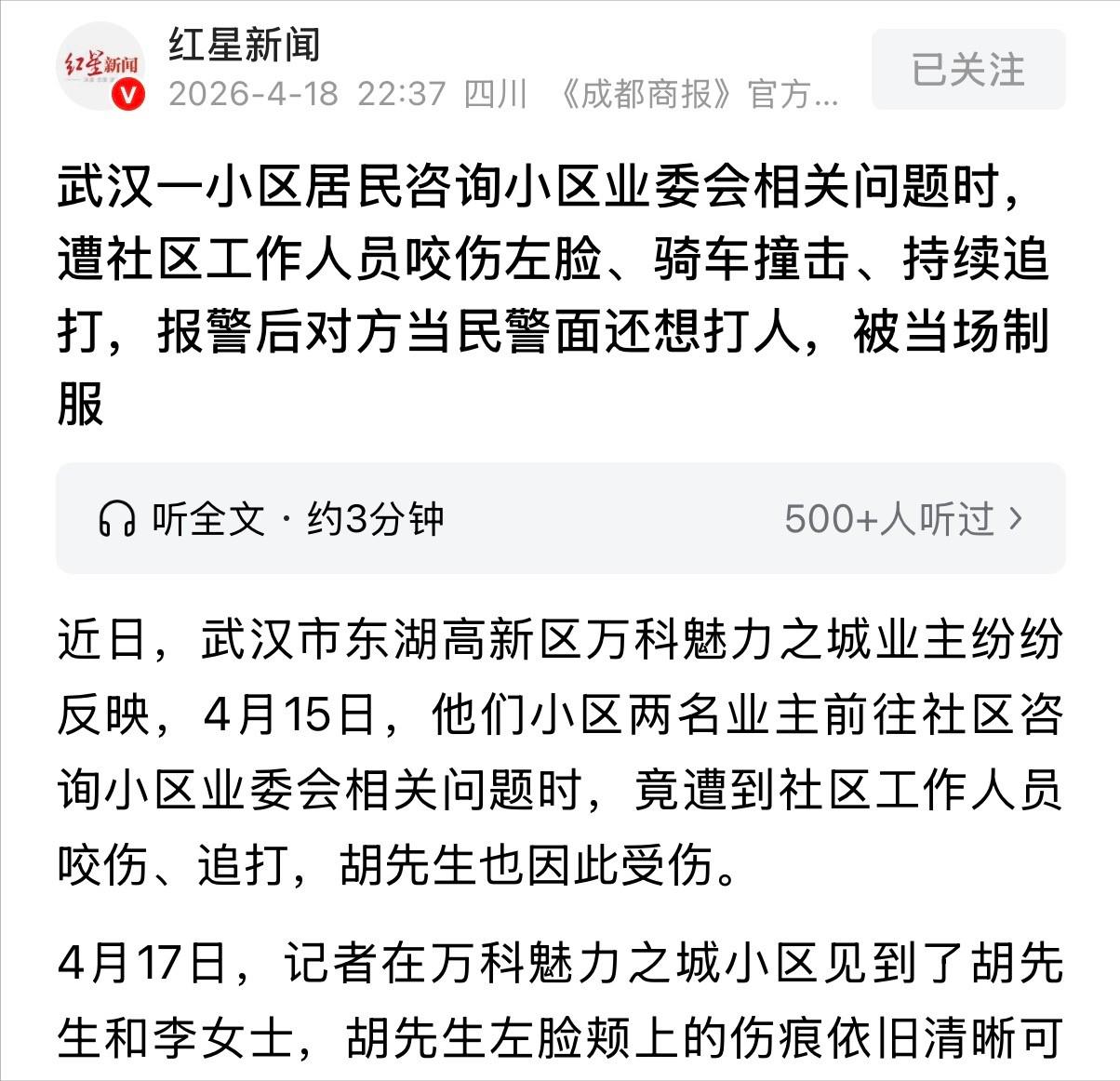 🌙“离大谱!”湖北武汉,一男一女两名业主,前往社区办公室咨询业委会的事,期间见没人搭理自己,便打算离开。怎料一名男性工作人员突然冲了出来,一把差点推倒抱着孩子的女业主,而后又抱住男业主,朝男业主脸上咬了一口。两名业主懵了,转身就跑,哪曾想对方并没有罢手,多次追击男业主,直到男业主报警,民警赶到现场,当着民警的面,还想打男业主。