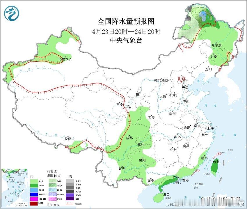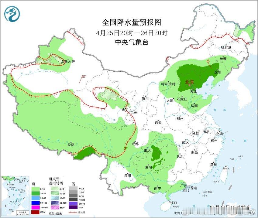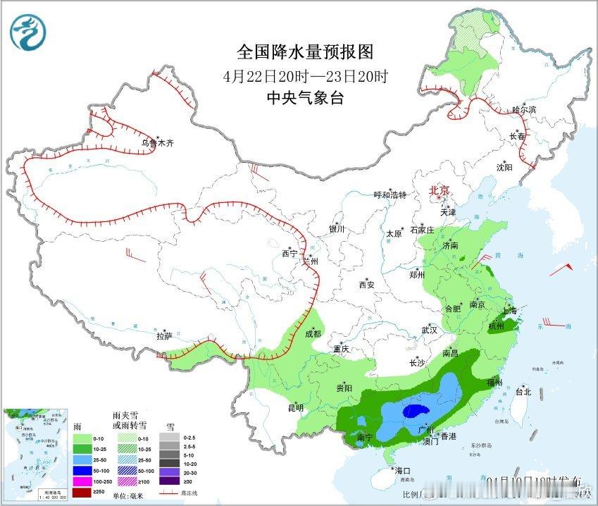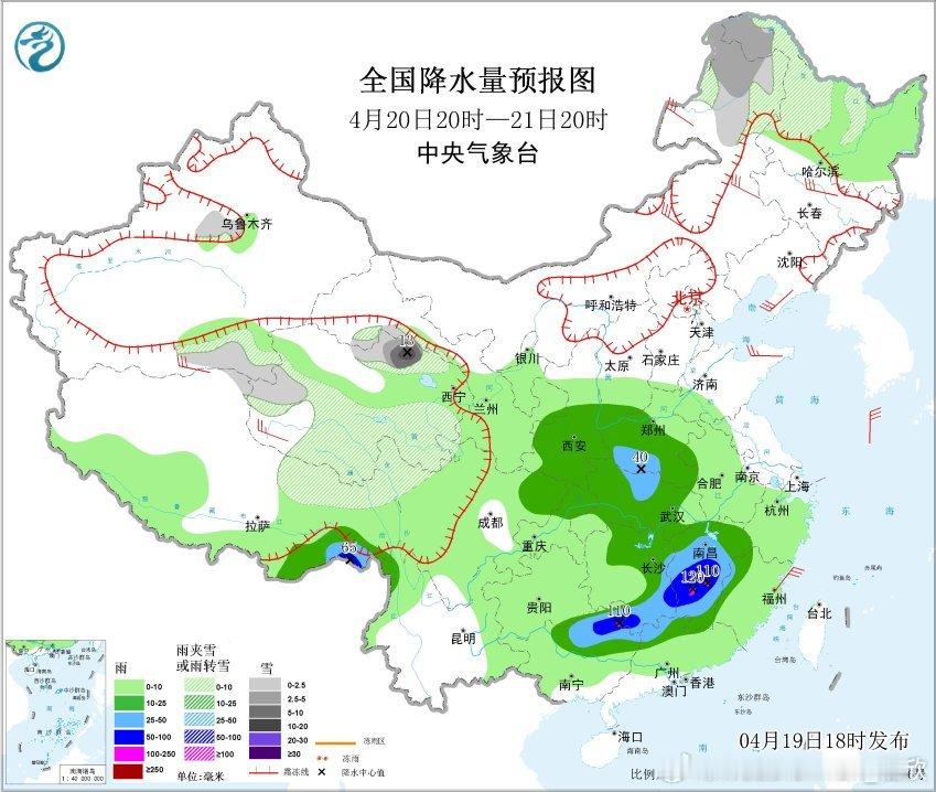 4月20日20时至21日20时,青海北部局地有大到暴雪(10~13毫米);西藏东南部、西北地区东南部、黄淮西部、江汉大部、湖南东部、江西大部、华南北部等地部分地区有中到大雨,其中,西藏东南部、湖南南部、江西中南部、广西东北部等地部分地区有暴雨或大暴雨(100~120毫米)。