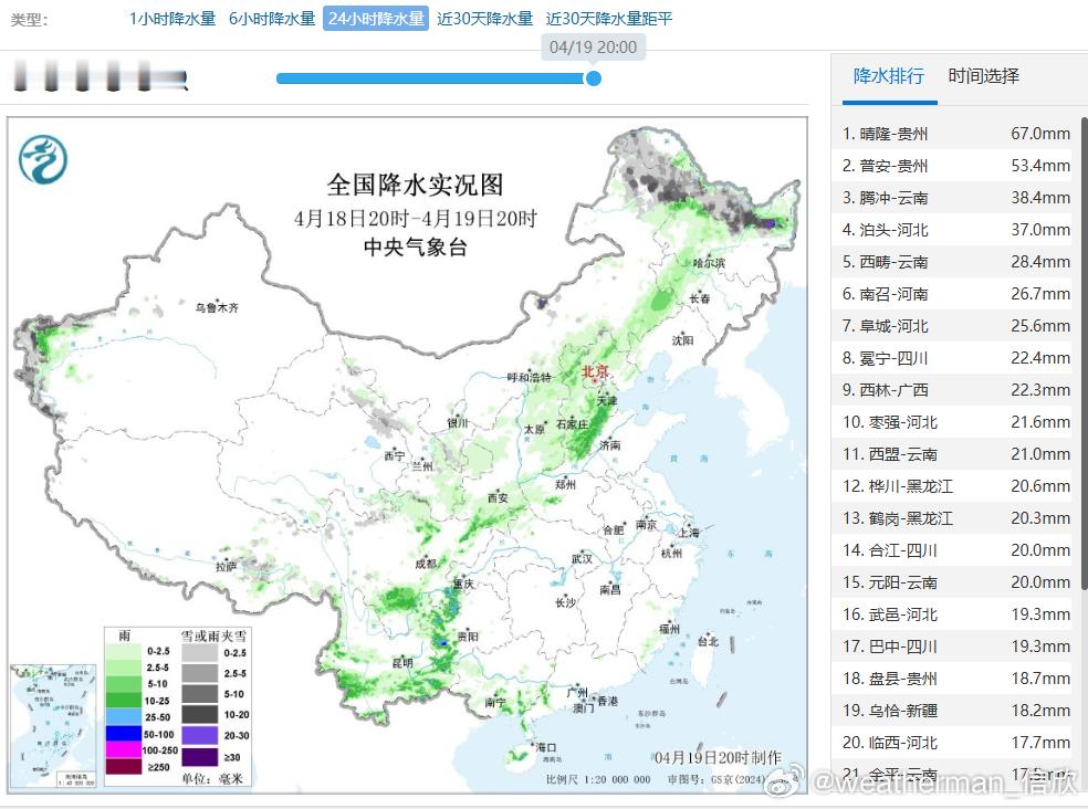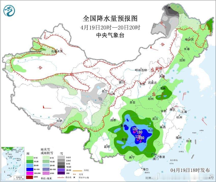 今晚中央气象台发布暴雨蓝色预警:预计,4月19日20时至20日20时,贵州中东部、湖南、广西北部、重庆中南部、四川东北部等地部分地区有大到暴雨,其中,贵州东部、湖南西部和南部、广西北部等地局地有大暴雨(100~130毫米)。此外,内蒙古东北部、黑龙江西北部等地有大到暴雪(10~13毫米)。