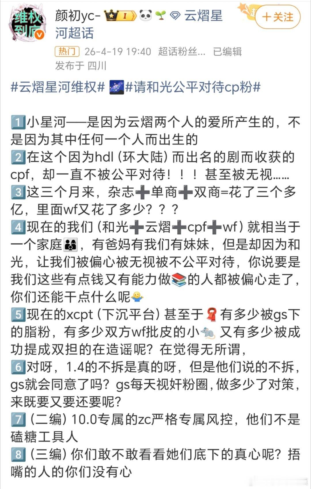 云熠星河维权10.0粉丝维权剧火了CP粉冲销量冲数据,钱花了热度带了,结果公司转头就偏心唯粉,连基本的公平对待都做不到。一边赚着CP粉的钱,一边又踩CP粉,这种操作真的很败好感。