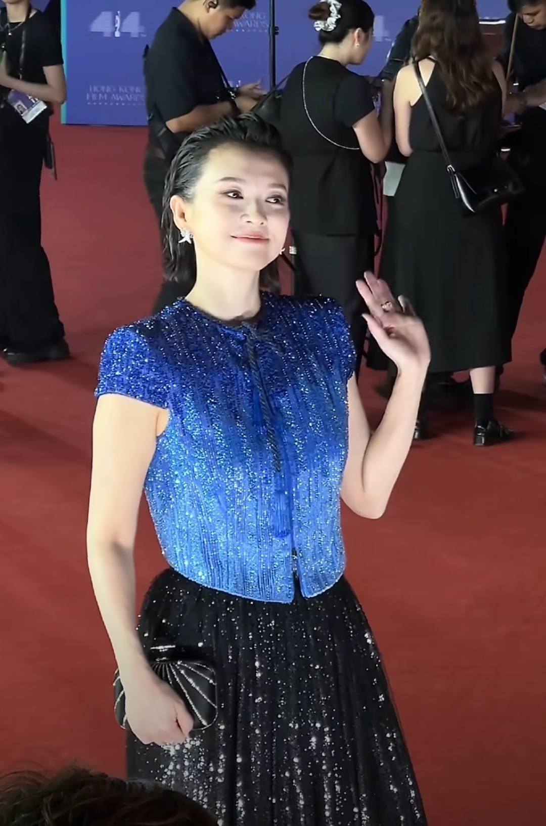 章子怡压轴现身香港金像奖红毯,穿着一身阿玛尼高定,戴着蒂芙尼珠宝,留着一头短发,