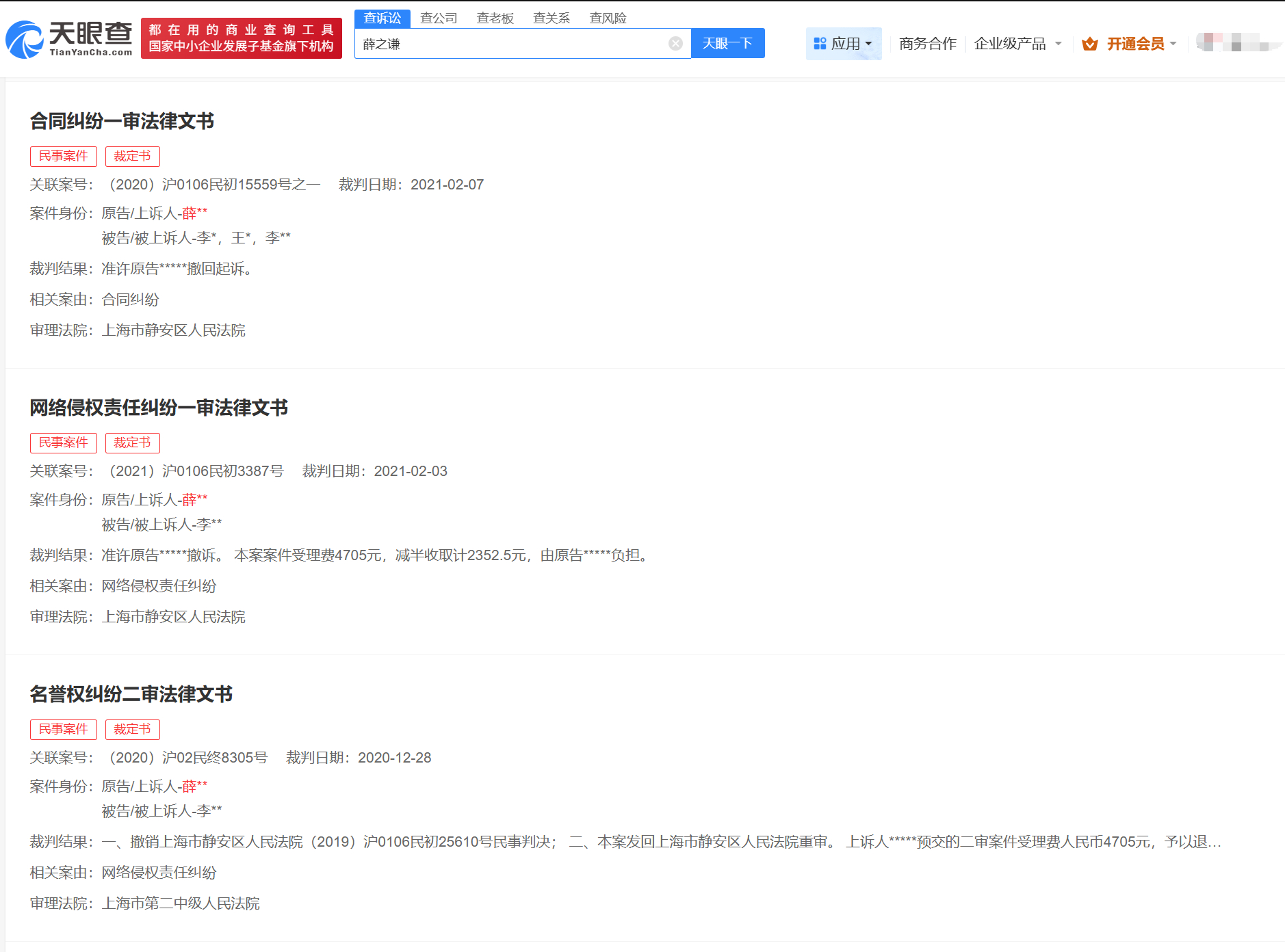 【薛之谦诉李雨桐部分案件已撤诉】薛之谦方回应李雨桐被行拘 4月19日,据法治进行时报道,李某桐因泄露薛之谦手机号、身份证号,被北京朝阳分局依法行政拘留。 查询天眼查App显示,薛之谦名下关联4家企业,其中2家为存续状态,包括天津初学者企业管理咨询中心(有限合伙)、上海潮石文化传播有限公司,此外,上海非武将文化传播工作室、上海良园文化传播工作室已注销。 天眼风险信息显示,薛之谦曾多次起诉李雨桐侵权,案由包括名誉权纠纷、合同纠纷等,其中部分案件判决结果为准许原告撤诉。