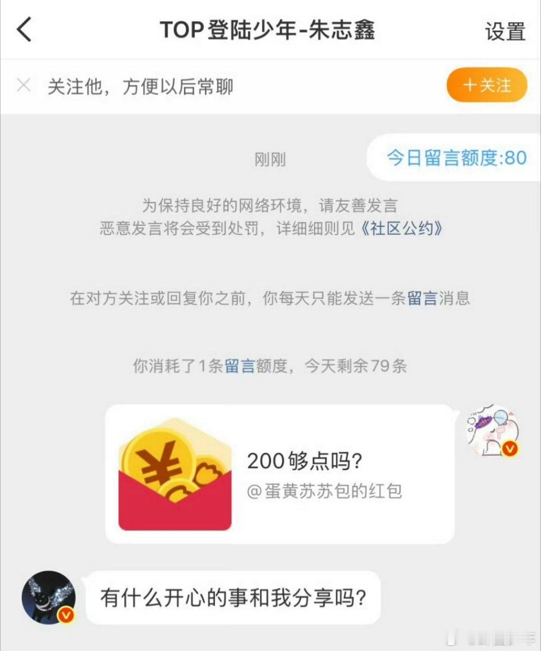 粉丝给朱志鑫苏新皓发红包 朱志鑫粉丝与苏新皓粉丝互发红包,双方粉丝以这种方式友好互动,场面十分和谐。