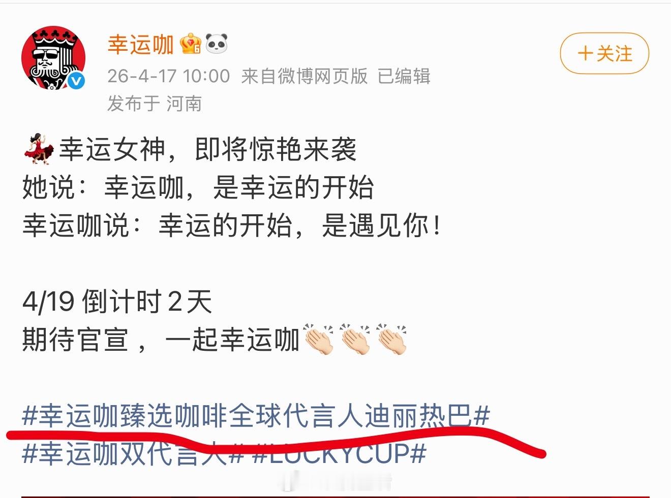 记得幸运咖当时给王俊凯的title是全球代言人,给迪丽热巴和梁朝伟的title是品牌代言人,不过单独给迪丽热巴了一个幸运咖臻选咖啡全球代言人。