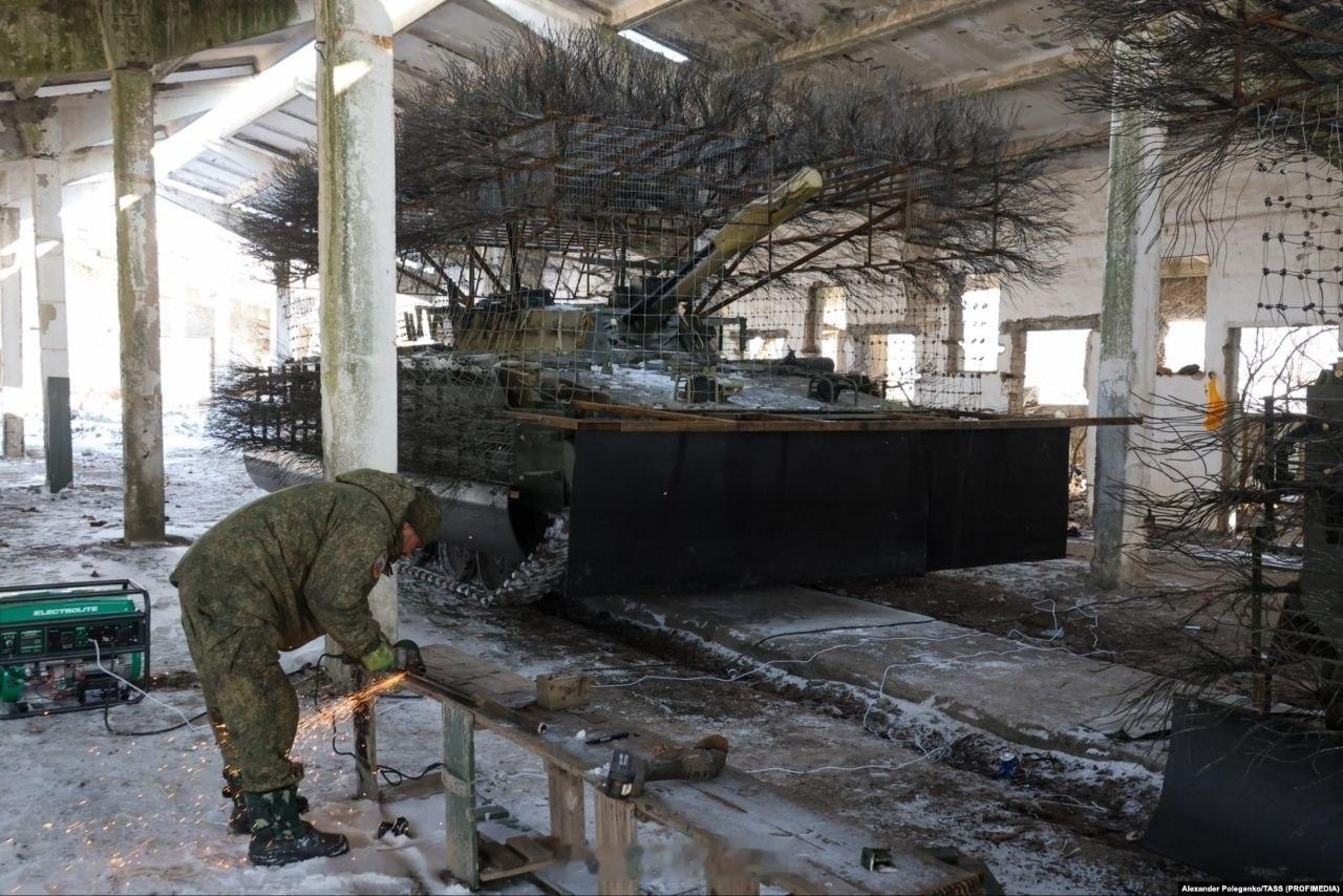 俄军疯狂的麦克斯版BMP-3步兵战车,安装了附加装甲套件,顶棚、车顶钢缆束、车首的橡胶间隙装甲,以及顶棚周边的金属网。特别是上部的大顶棚、爆反装甲加大量杆子上的“蒲公英”组成的无人机防护体系,整个一个疯狂的麦克斯版。俄军的T-90M主战坦克也是如此装扮。都是无人机给逼的。