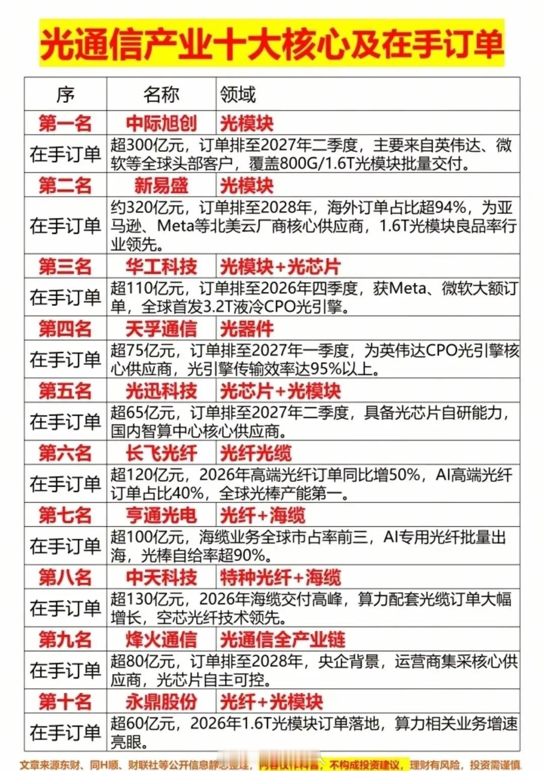 订单排期拉满,业绩爆发在即!从国产存储、绿电、创新药,到光模块、锂电池,再到光通信全产业链,多大赛道龙头订单狂揽百亿甚至千亿,排期最长已至2030年,叠加部分公司业绩同比暴增超30倍。✅存储芯片:最高狂揽380亿订单,排期至2028年✅绿电赛道:手握2000亿订单,排产延伸至2030年✅创新药:年报业绩最高暴增3007.39%✅光模块/光通信:320亿订单在手,产业链景气度持续上行✅锂电池:千亿级订单锁定,产能排期直逼2030年。⚠️以上内容仅为公开信息整理,不构成任何投资建议,理财有风险入市需谨慎。