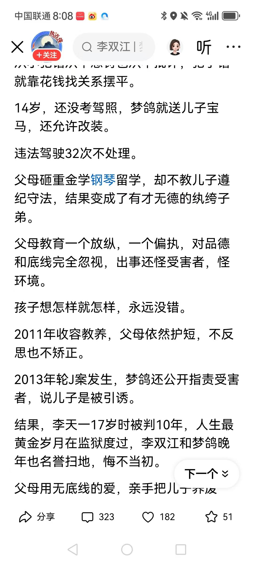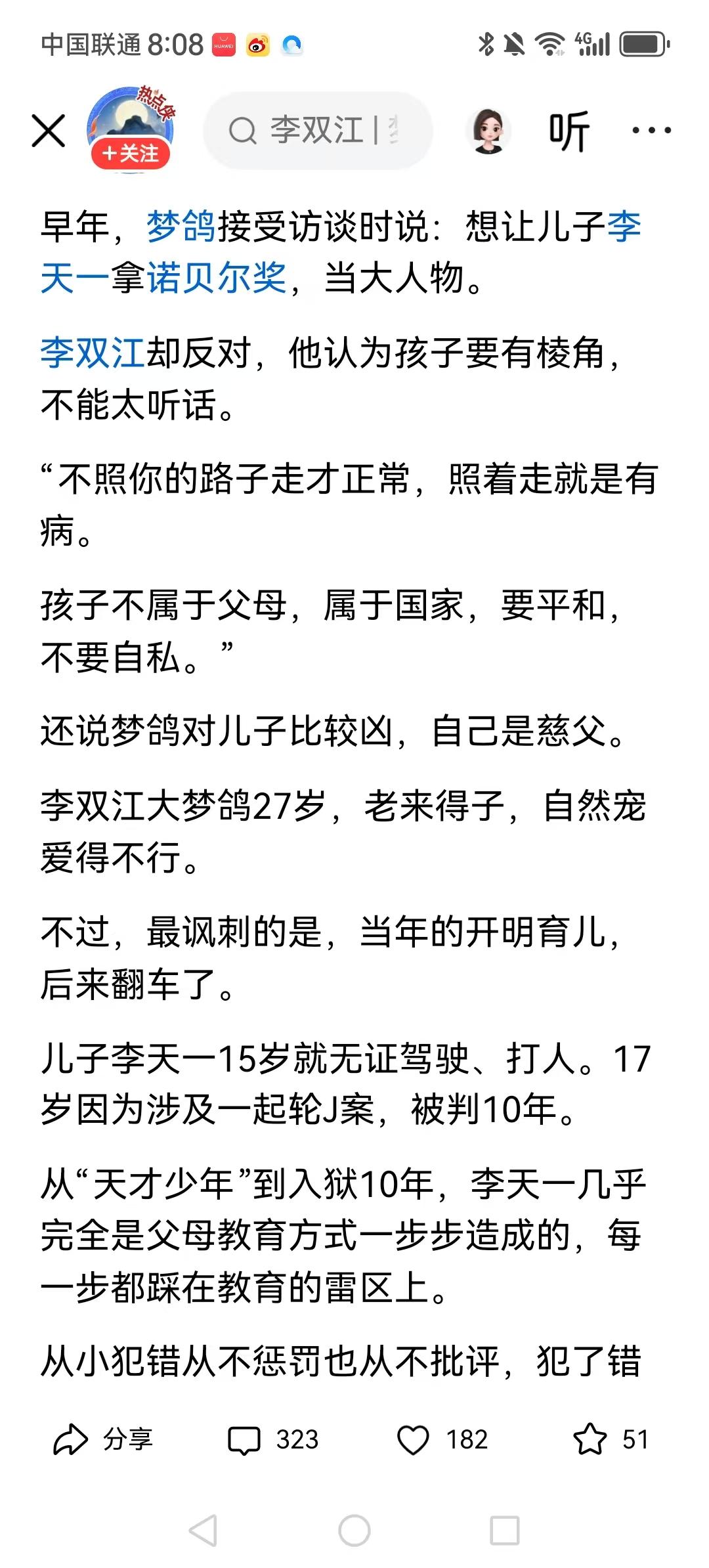 早年,梦鸽接受访谈时说:想让儿子李天一拿诺贝尔奖,当大人物。所以,梦鸽这人是没有是非观念的,说受害人引诱她儿子,就跟狼吃羊前还怪羊长的太肥嫩一样。