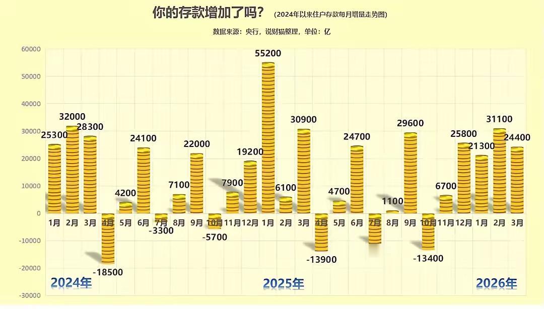 一,利率越来越低,但大家却还在疯狂存钱。昨天,新的存款数据正式公布了,让很多人都觉得震撼。今年短短3个月,储户存款猛增7.68万亿,相当于每个月存款新增超2万亿。这可是住户存款,和我们息息相关的数据。3月份,储户存款增加了2.44万亿。要知道,现在银行的利率是越来越低,以前是银行希望你来存钱,现在是银行“讨厌”你来存钱,利率已经低得非常吓人,但大家存款的热情却反常的猛增。