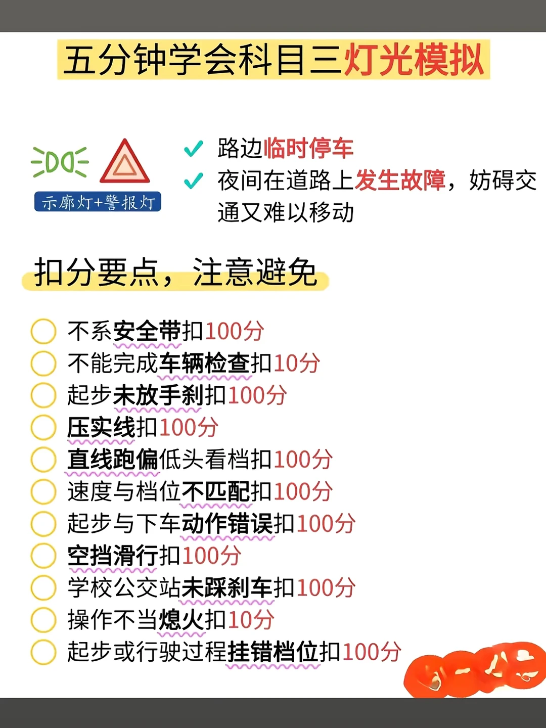 起步:开左转灯、按喇叭、挂挡、松手刹、左右观察再起步靠边停车:开右灯,靠右边停车,30厘米以内不扣分,大于30小于50厘米扣10分,大于50厘米扣100分