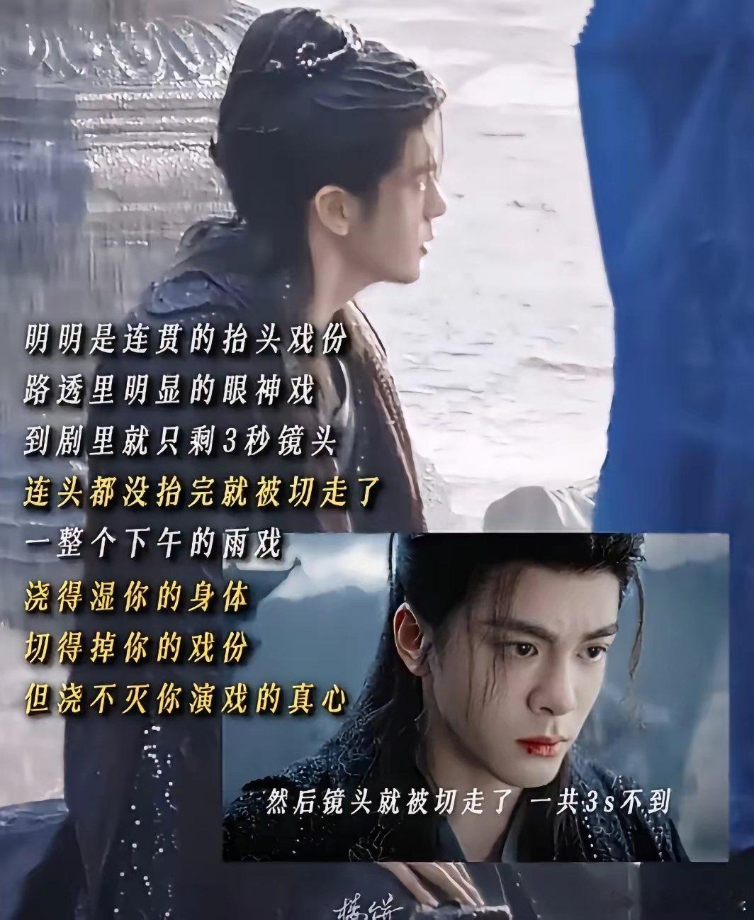 曾舜晞一语成谶,说三秒就三秒。讨论度挺高的《月鳞绮纪》终于播完了。有网友说,曾舜晞为什么要接这部剧?曾舜晞采访中曾说,看了前五集剧本后接了,而且哪怕镜头只有三秒,能看到不一样的曾舜晞就是值得的。原本以为这句话只是客气,怎么可能只有三秒,但一语成谶。武拾光,平番男主,第24集戏份仅仅只有三秒。这就是演员淋了那么久的雨出来的成果,明明路透里有连贯的抬头戏份,有饱满的情绪,可实际镜头马上就切走了。演员的情绪到位了,可是剧外的观众却感受不到,因为镜头不在他的身上。你觉得这部剧他接得值吗?