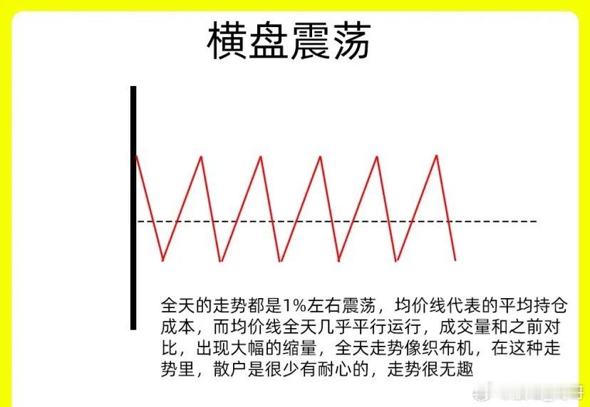 也叫织布机走势,在分时图里,全天走势处于一个横盘震荡的过程,可能一分、两分之间的震荡。均价线基本处于一个持平的走势。这是主力想磨的筹码松动的表现,这种走势,散户是能有那么高的耐心的