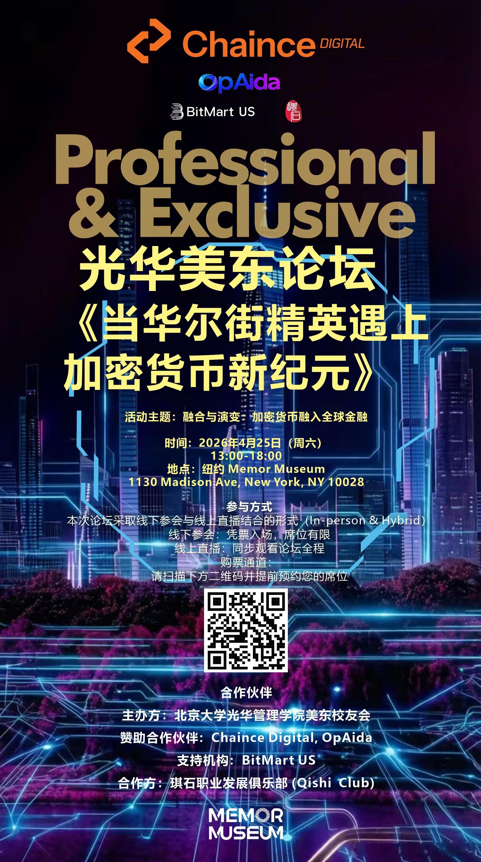 我将在4月25日(周六)参加北大光华纽约论坛,主题是"加密货币融入全球金融"。三场Panel覆盖加密交易与Alpha、AI×区块链、RWA与稳定币。 限50人闭门论坛,地点在纽约上东区Memor Museum。推文详情:网页链接 报名链接:网页链接 使用折扣码GUEST 可享专属优惠价