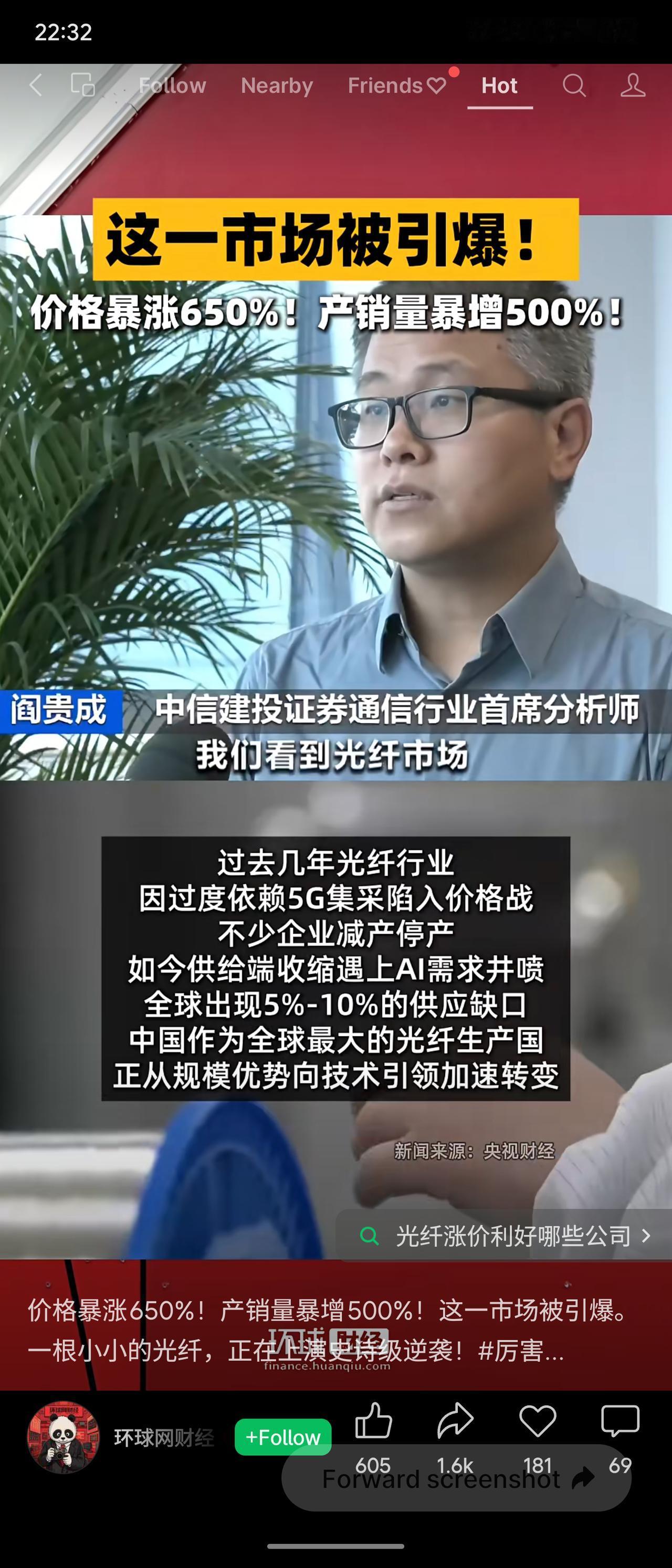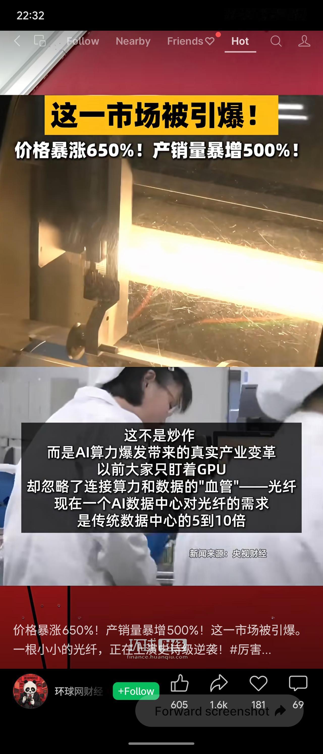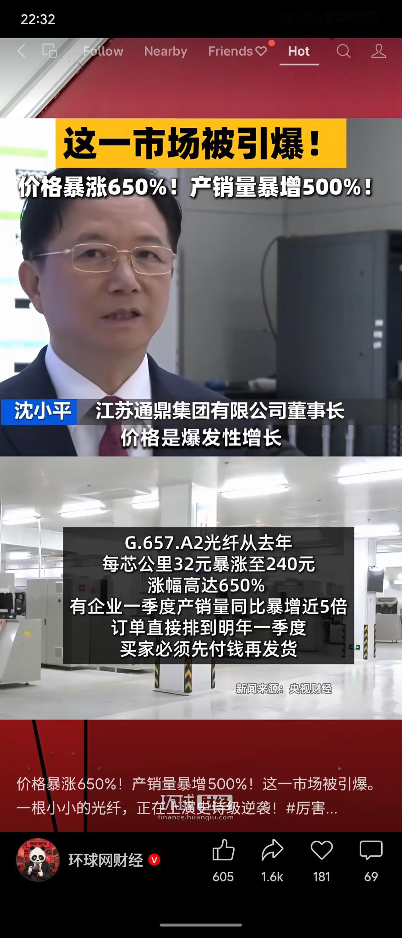 光纤市场被引爆:G.657.A2光纤价格从去年每芯公里32元暴涨至240元,涨幅650%,有企业产销量暴增近500%,订单排到明年。原因是5G价格战导致供给收缩,叠加AI需求井喷,全球供应缺口5%-10%。中国光纤正从规模优势转向技术引领。