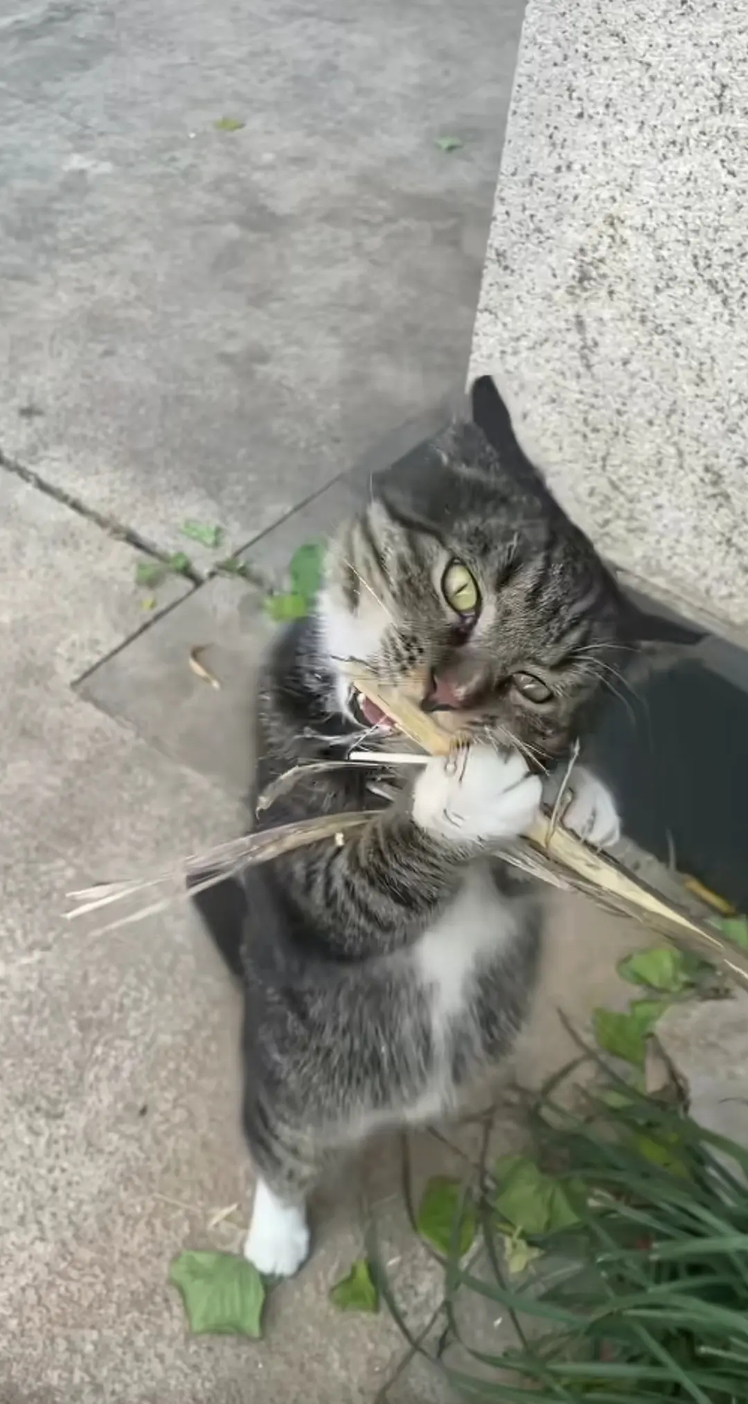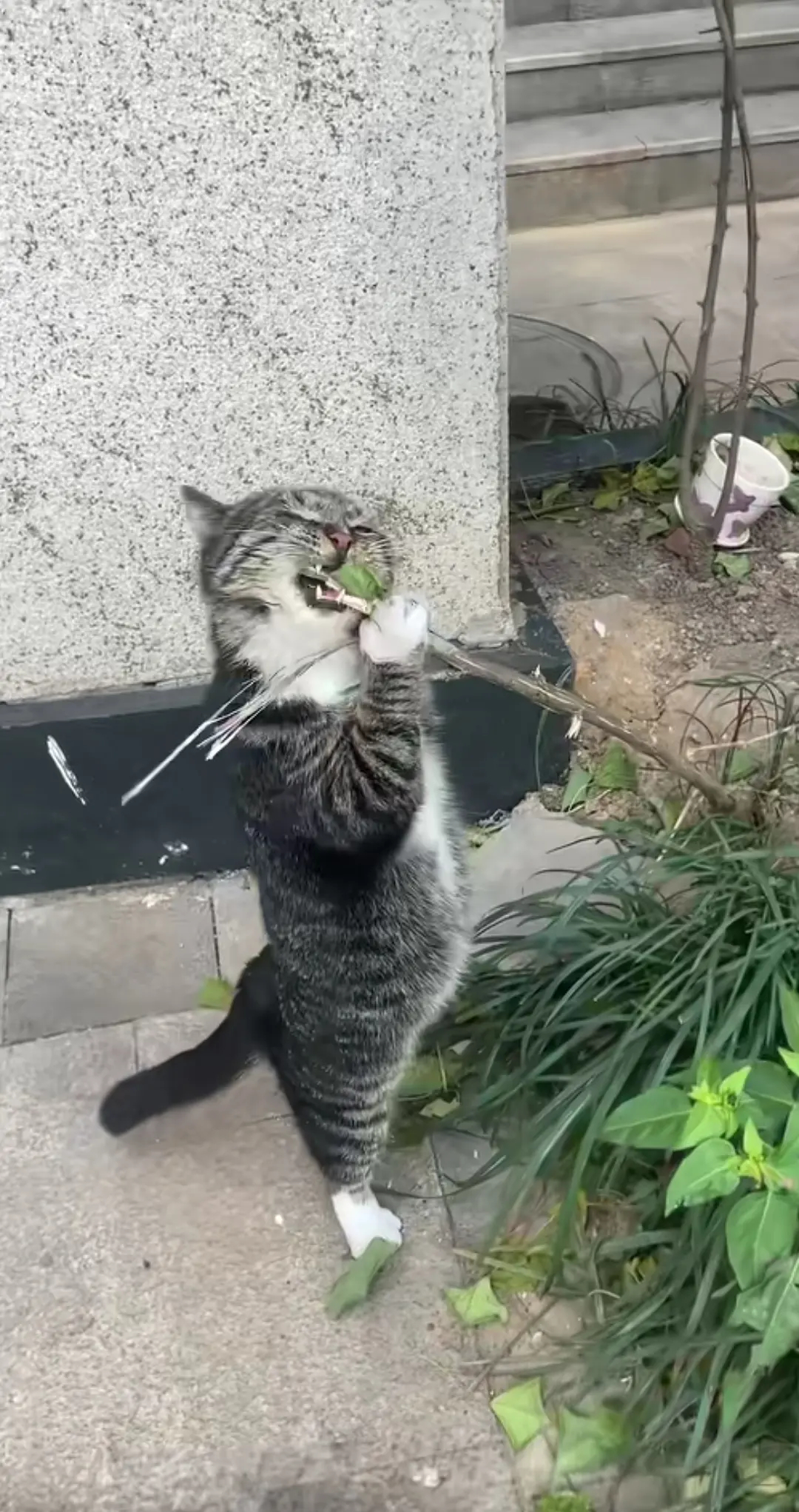 猫咪吃草的我看到过,这抱着树叉子张开大嘴巴一口一口咬的,我还是第一次看到过!
