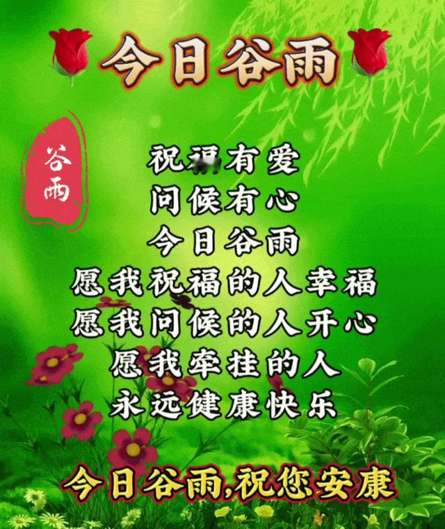 谷雨时节花正艳,微风拂绿千万片,燕子衔泥筑新院,鲤鱼跃水舞翩跹,世间繁华皆可见,心中无私天地宽,愿你一生总如愿,美梦连连得实现,健康长寿过百年,阖家团圆乐无边。