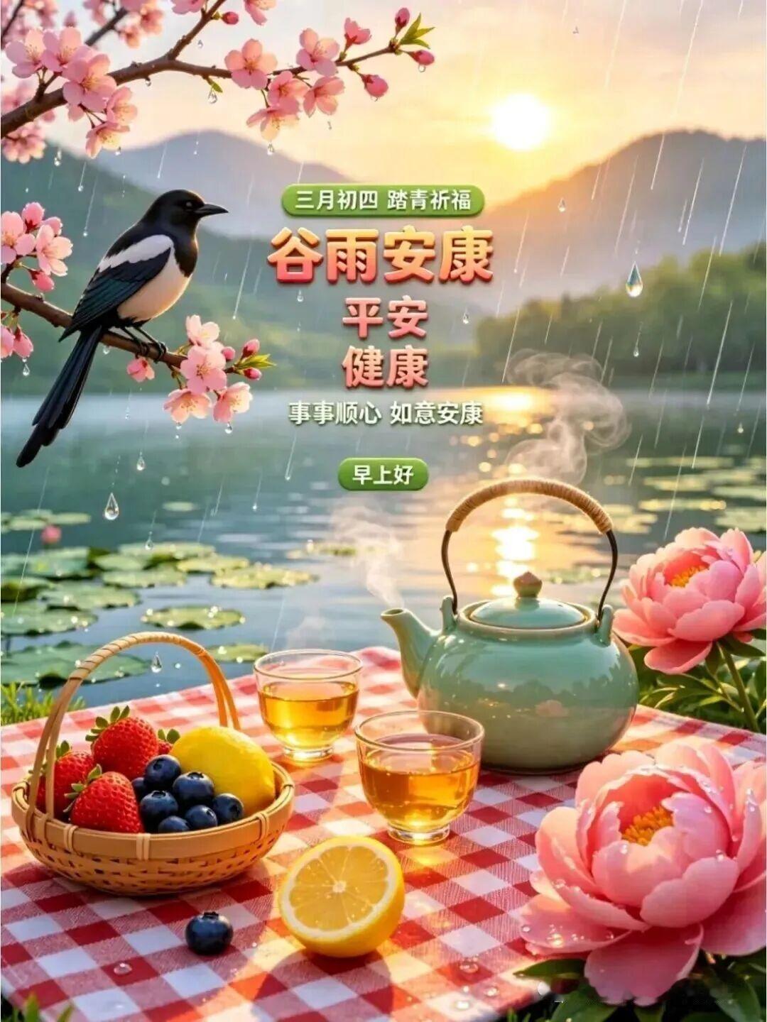 春风藏暖意,谷雨送安康,早安!愿细雨滋润美好,好运伴随日常,愿你不负时光,不负自己,平安喜乐,万事胜意,幸福常伴身旁。🙏🍀🌼🍒🌱