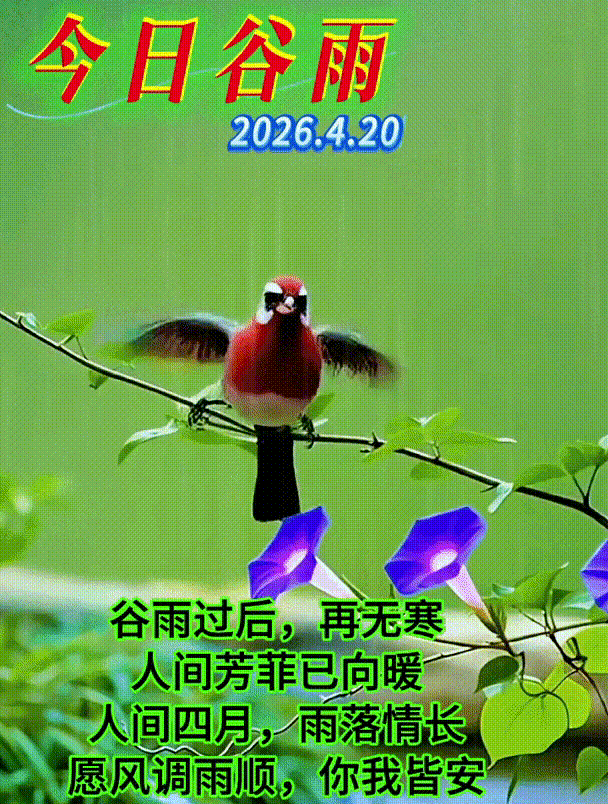 今日是谷雨节气,大家早上好!谷雨天晴,春和景明;霖雨润心,芳华自绽。愿亲们沐春风、赴安暖,不负暮春好时光,三餐四季皆顺遂,喜乐常伴,岁岁安康🙏🍀🌼🍒🌱