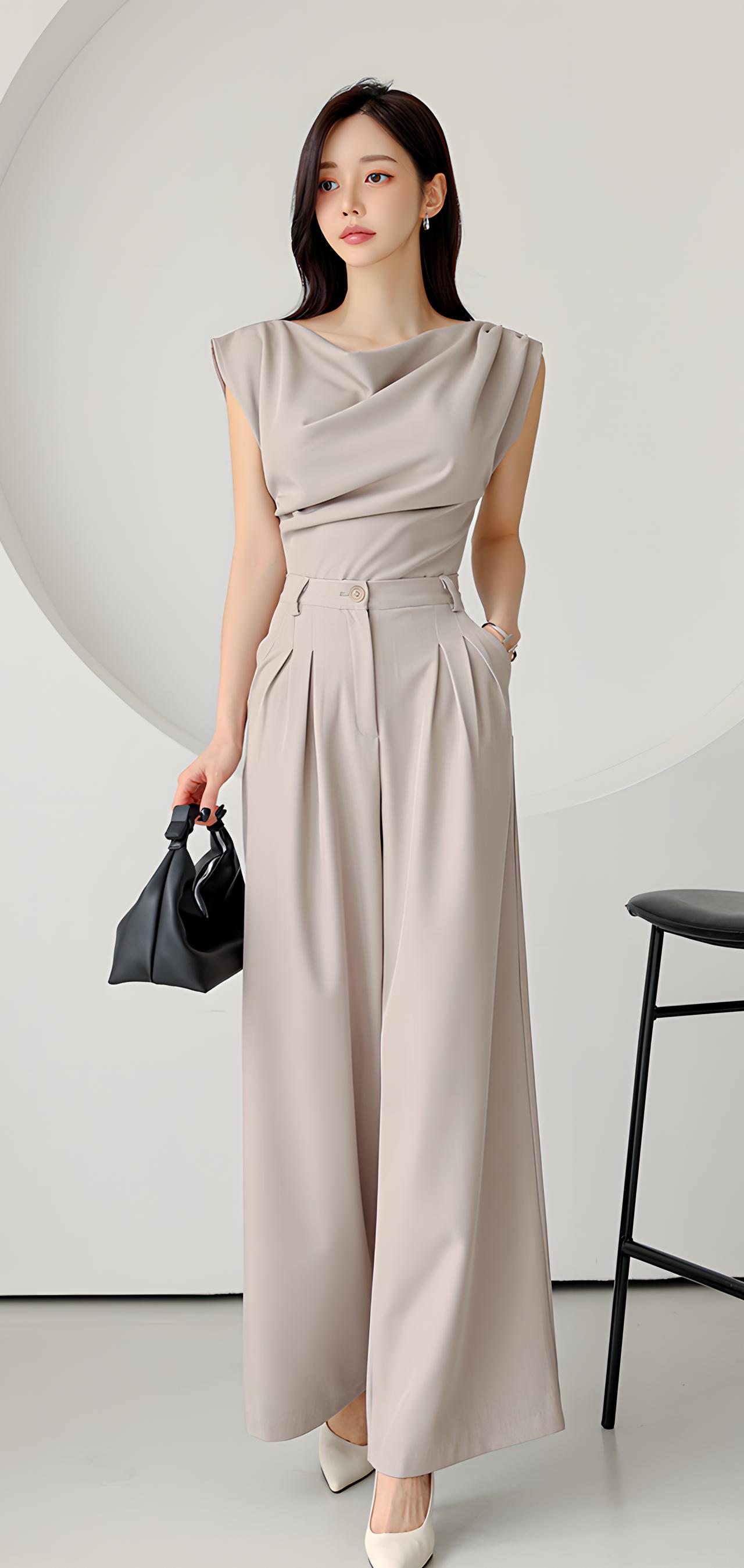 这套是“轻熟通勤风”穿搭,兼顾干练与温柔,适配多场景:-内搭选了黑色无袖