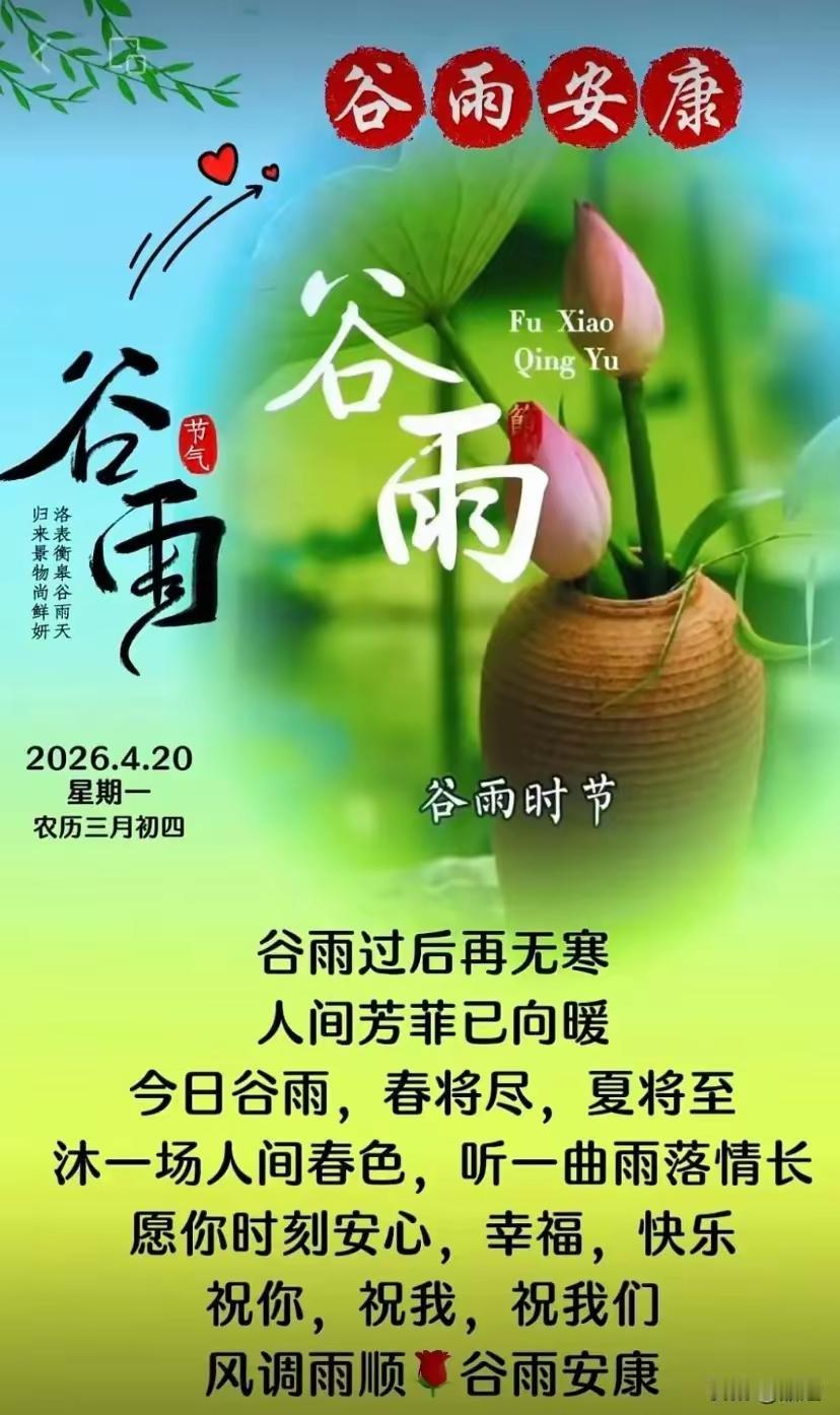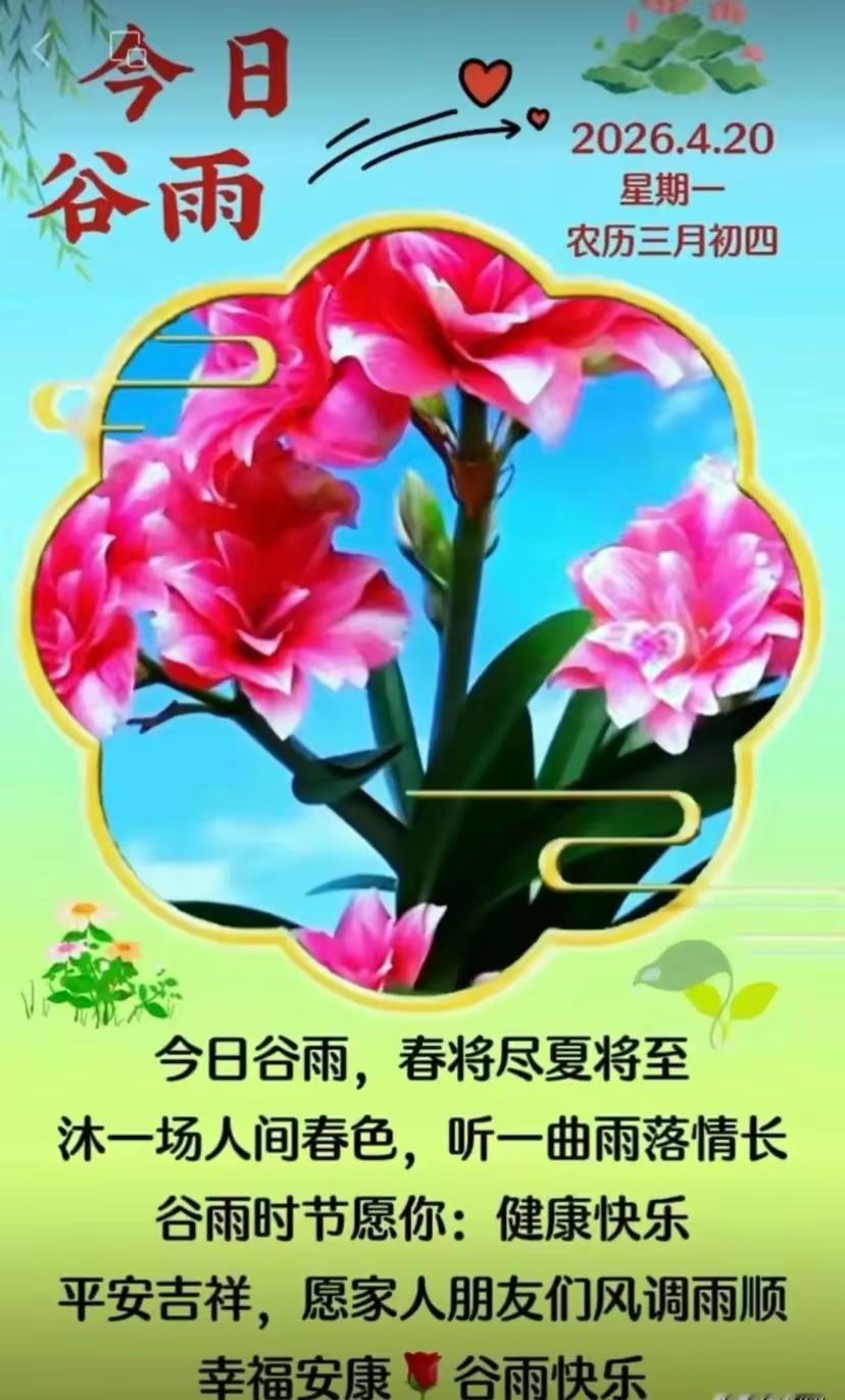 周一晨光暖,谷雨润心田。新一周携着春日温柔启程,步履从容,奔赴热爱。真心感谢我的粉丝和友友们,一路相伴相守,有你们才有我今天的温暖与底气。愿大家不慌不忙,向阳生长,家人平安,挚友常伴,万事顺遂,好运常随!