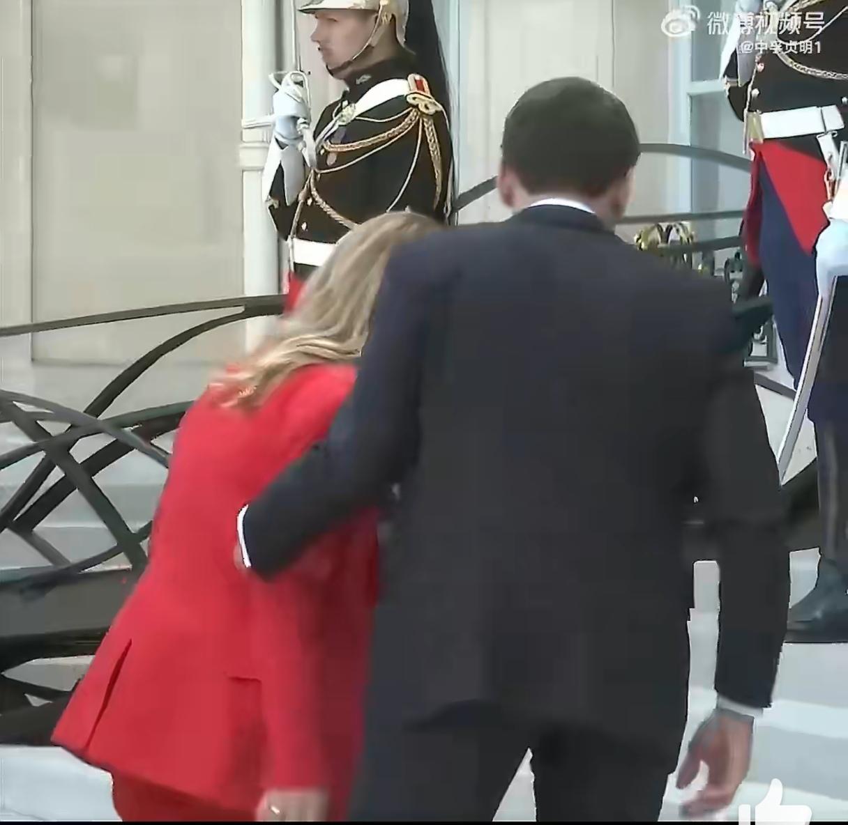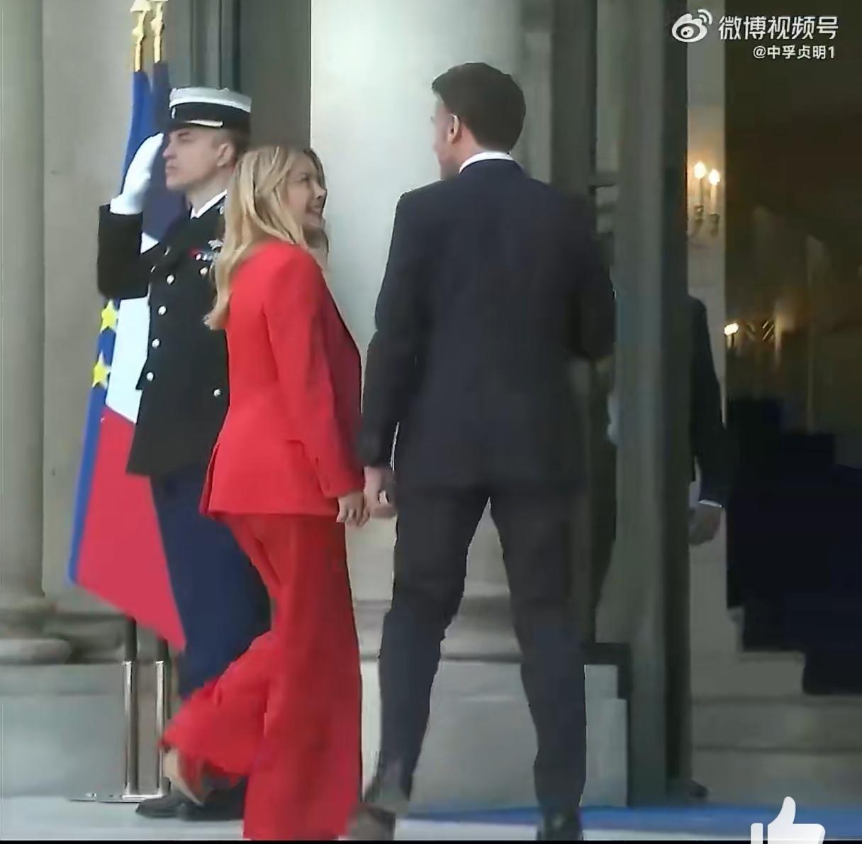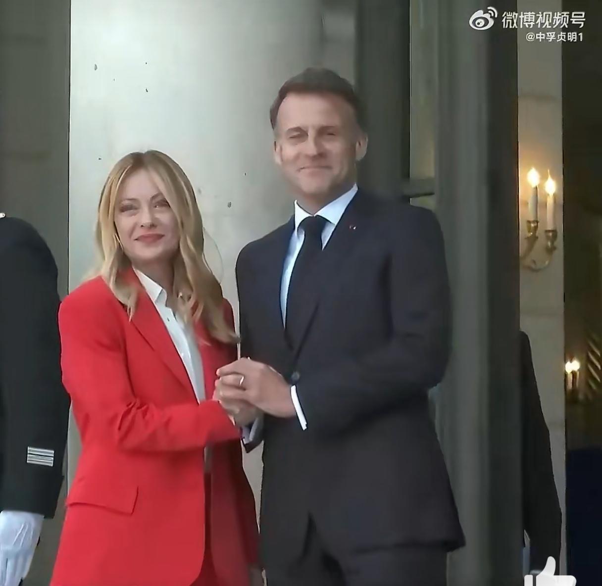 4月17日到爱丽舍宫参加霍尔木兹海峡航行自由国际会议意大利总理梅洛尼,刚一打开车门,法国总统马克龙就一个大大的拥抱,然后贴面礼,左边贴了贴右边,久久不愿松开,然后马克龙的左手一直亲轻扶着梅洛尼的后背走上台阶、转身、合影。热情的马克龙把梅洛尼整的娇羞不已。而对比起前几天在东京,马克龙虽然也热情,但隔空比手势,丝毫不靠近,待遇天壤之别啊。网友们戏谑马克龙晚上回家要跪搓衣板。