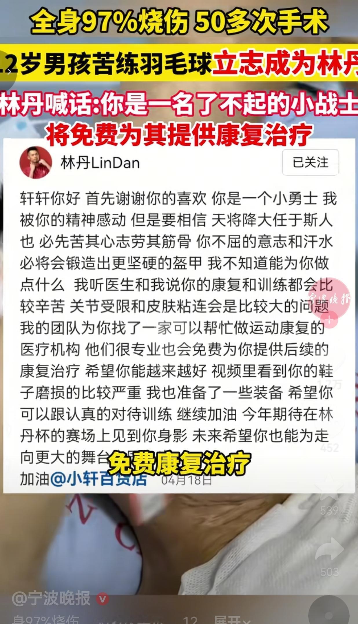 林丹没说半句漂亮空话,没搞虚头巴脑的作秀,直接发长文认认真真回应:“轩轩你好,你是一个小勇士。我的团队为你找了运动康复机构,免费提供后续治疗;看你鞋子磨得厉害,也准备了专业装备。今年,期待在林丹杯的赛场上见到你。”