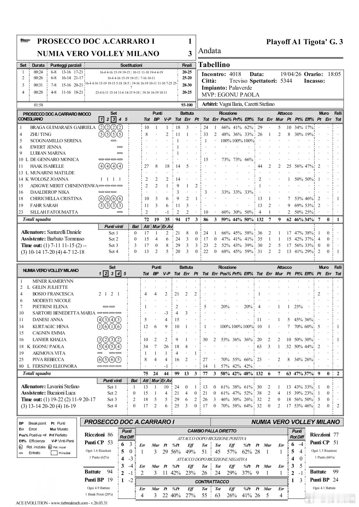 国际排坛动态科内利亚诺意甲女排联赛决赛第三场:科内利亚诺主场1-3(20-25/25-20/28-30/20-25)米兰米兰在客场3-1击败科内利亚诺,将总分扳为1-2。仍有优势在手的科内利亚诺4月23日02:30 客场再战米兰,赢球仍可夺冠。朱婷8分 26扣8中1失误2被拦,双率31%19%,接了33个一传2失误,到位率48%;艾格努34分当选MVP米兰-科内利亚诺进攻:63-62;拦网:9-7;发球:3-3;自失:21-25艾格努34分 63扣32中 3失误1被拦 2拦;库尔塔吉奇12分 10扣7中 1失误 5拦;拉内尔10分 20扣10中 2失误2被拦;皮瓦8分 23扣8中 2被拦;达内西5分 11扣5中 1被拦;博西奥4分 1扣0中 2拦2发;彼得里尼1分 4扣1中 1被拦;阿基莫娃1分 1发哈克27分 44扣25中 2失误2被拦 2拦;法赫尔11分 13扣9中 2失误 2拦;齐里切拉10分 13扣7中 1失误 2拦1发;加比10分 29扣10中 5被拦;朱婷8分 26扣8中 1失误2被拦;阿迪格韦2分 1扣0中 2发;西拉2分 4扣2中 1失误;沃沃什2分 2扣1中 1拦米兰女排