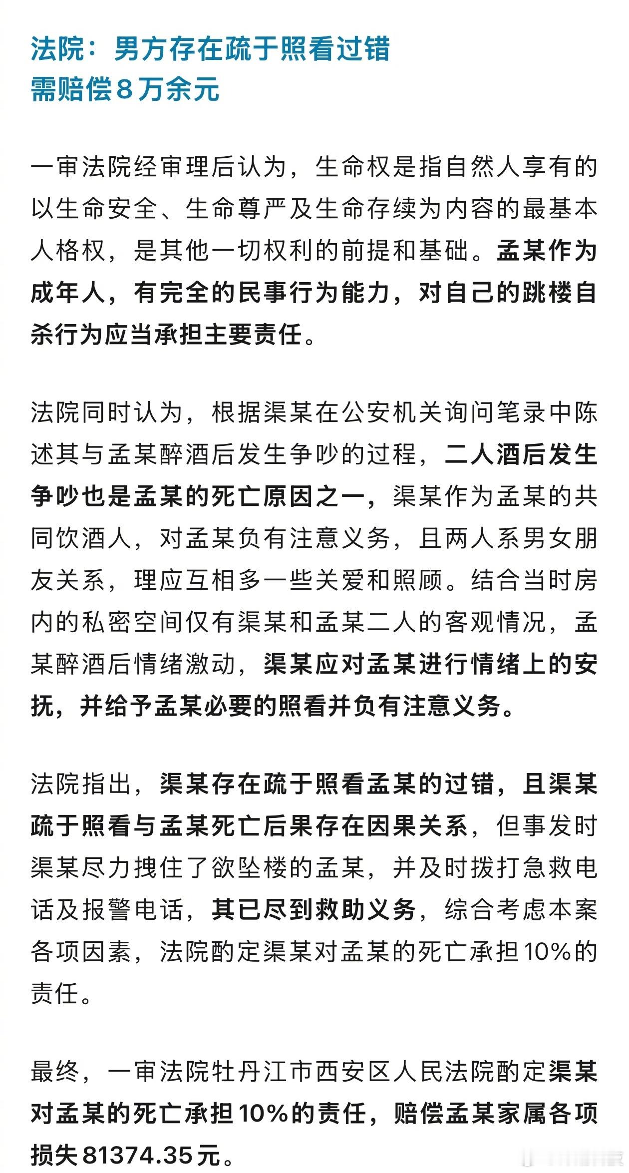 省流,男方存在疏于照看过错,承担10%责任,需赔偿8万余元。