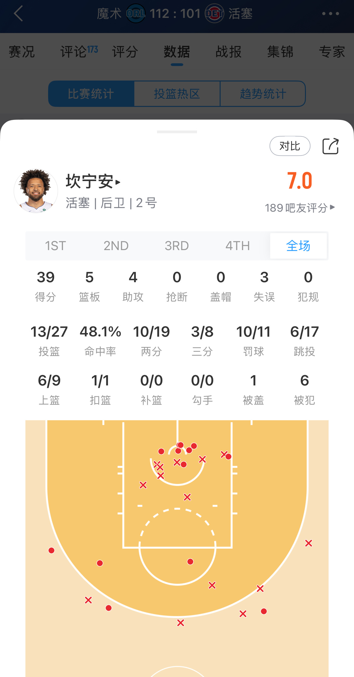 坎宁安空砍39分5板4助,27中13魔术vs活塞