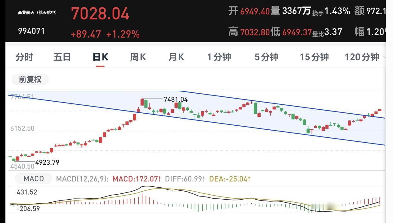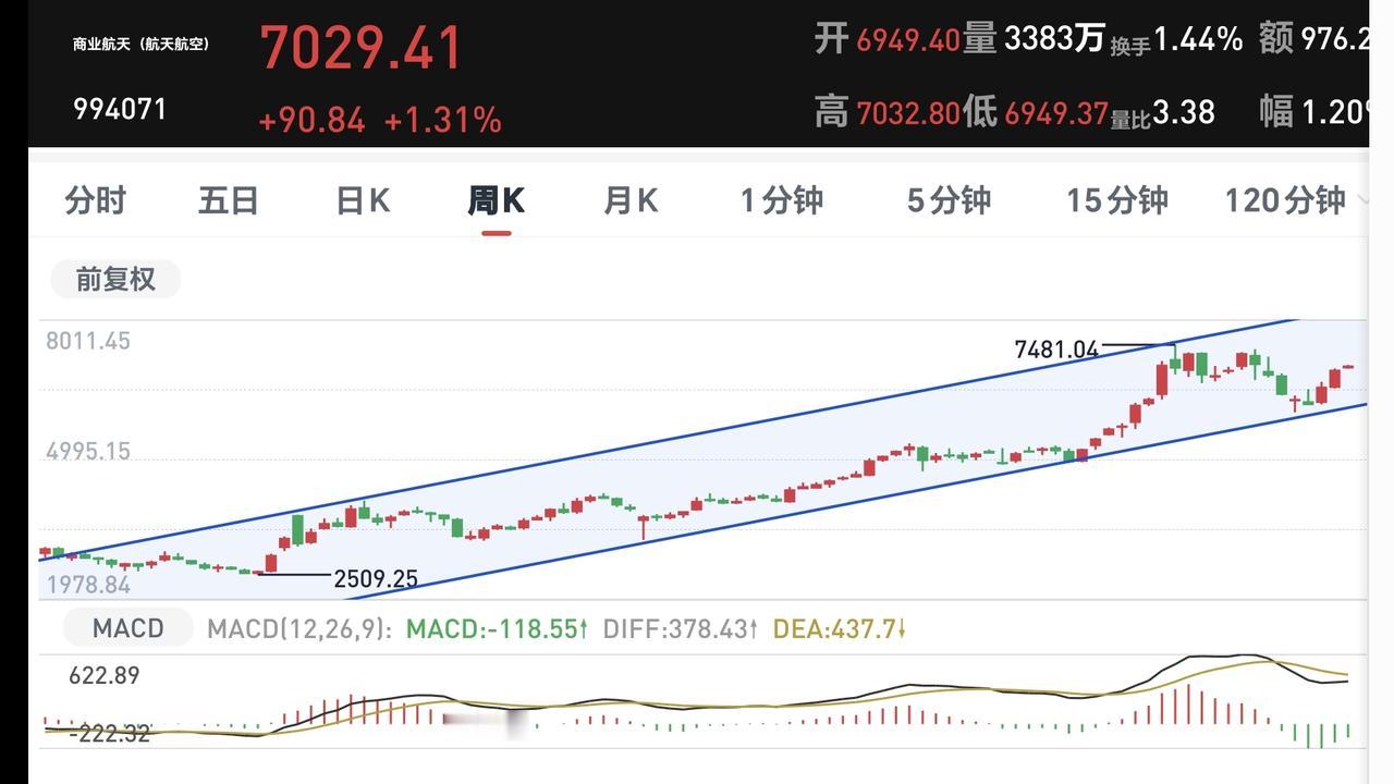 商业航天板块周线级别处于上涨通道中,只要不跌破这个周线级别上涨通道的下轨线,长线的人都可以继续持有。