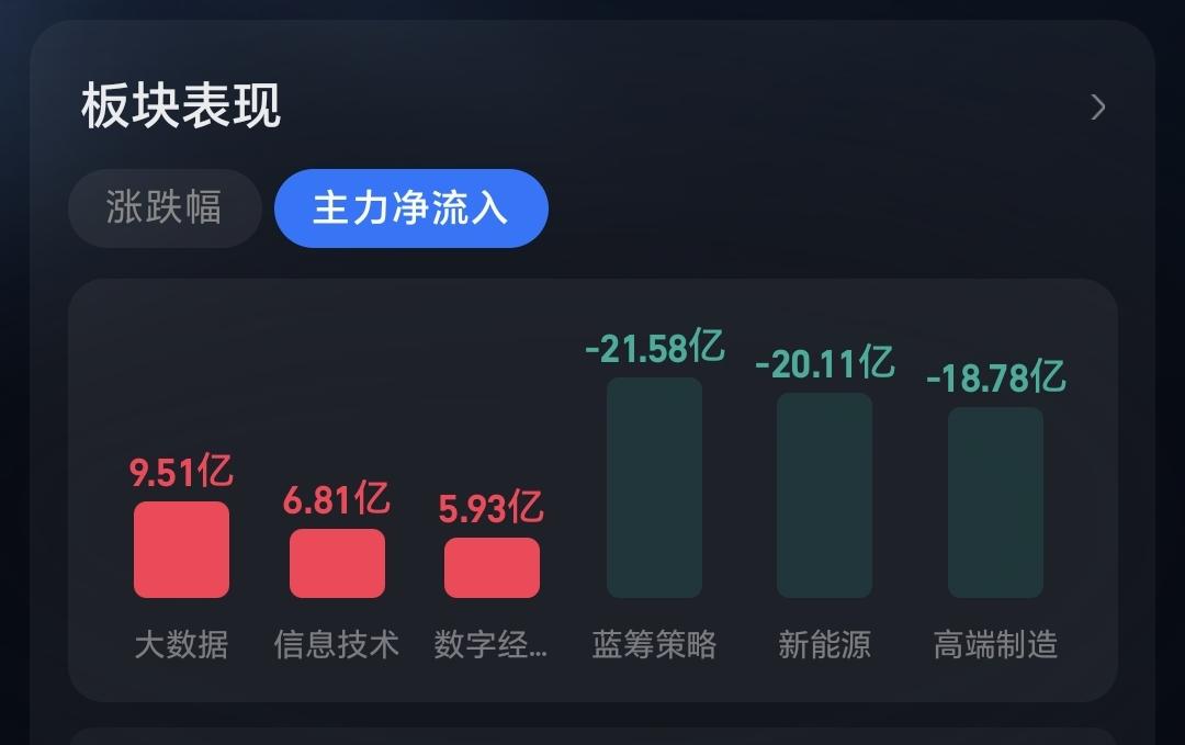 主力资金净流入最多的三个板块是:大数据板块,信息技术板块,数字经济板块,主力资金净流出最多的三个板块是:蓝筹策略板块,新能源板块,高端制造板块。
