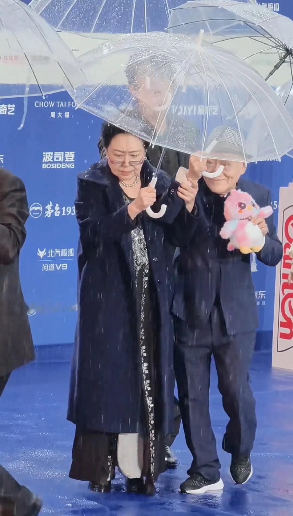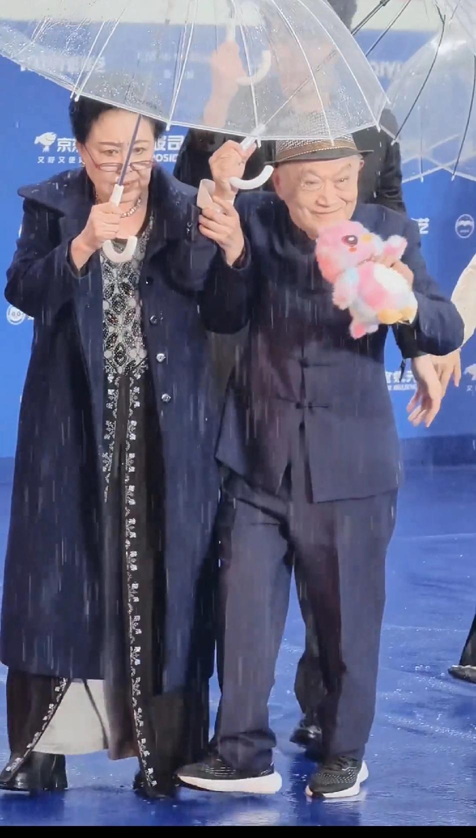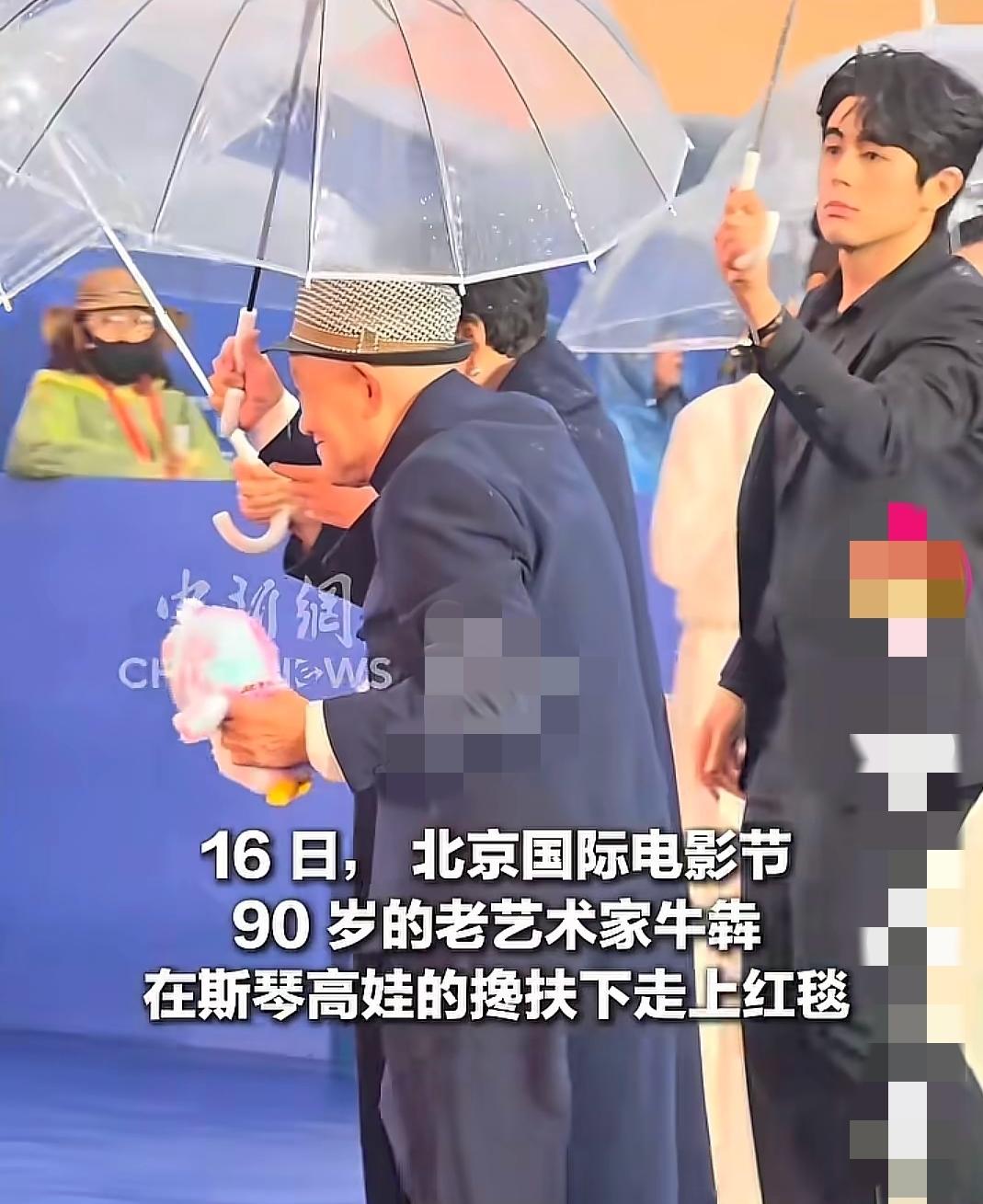 电影节主办方太能折腾90岁的牛犇老爷子!没有任何工作人员的陪同下,让76岁的斯琴高娃打着伞扶着90岁的牛犇下雨天走红毯?!上了年纪最怕摔跤,看牛犇老爷子走在这湿滑的路面上,让人提心吊胆!虽然老爷子举着吉祥物乐呵呵的,但旁边的斯琴高娃可是一点也乐呵不起来,她一直神情紧张的扶着看老爷子,生怕有一点闪失,斯琴高娃真的好,自己也是一大把年纪了,一点不矫情,伞一直偏牛犇那边,后面的帅小伙也不错,一直跟在身后给老爷子打伞,自己整个身子都淋湿了,感觉老爷子参加个电影节就是来历险的,这回是淋雨,上次是被安排和穿着恨天高的闫妮和张子枫走那么高的楼梯,闫妮穿那么高的鞋子和那么长的礼服照顾自己都困难,还得扶着老爷子,到最后都不知道是牛犇在扶闫妮,还是闫妮扶着牛犇了……电影节的组委会能不能为上了年纪的电影人考虑周到点?牛犇