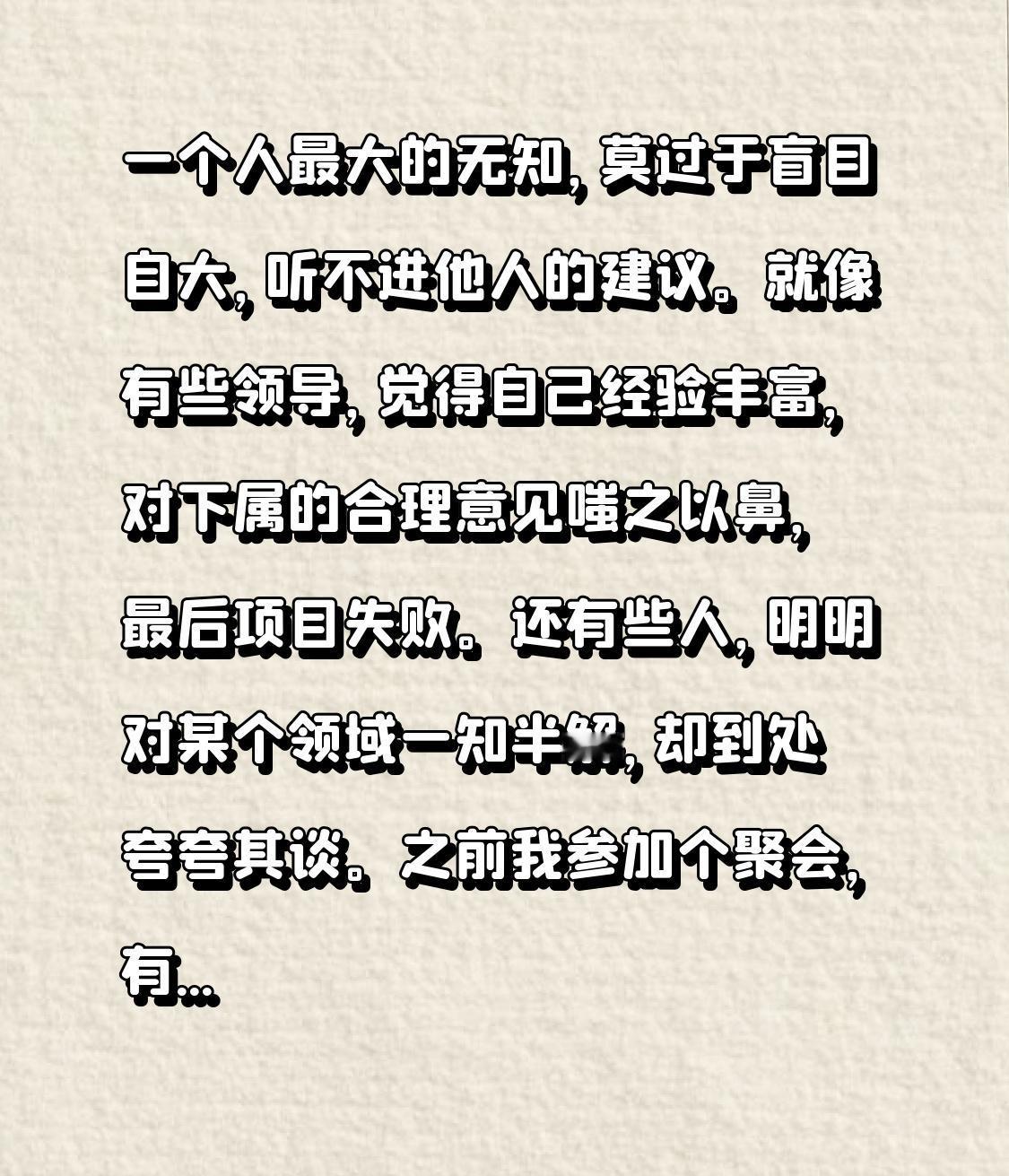 一个人最大的无知,莫过于盲目自大,听不进他人的建议。就像有些领导,觉得自己经验丰富,对下属的合理意见嗤之以鼻,最后项目失败。还有些人,明明对某个领域一知半解,却到处夸夸其谈。之前我参加个聚会,有个人不懂金融,却大谈股票走势,说得头头是道,结果都是错误观点。真正有智慧的人,会保持谦逊,不断学习。而无知的人,沉浸在自己的小世界里,拒绝成长,最终只会被时代淘汰。