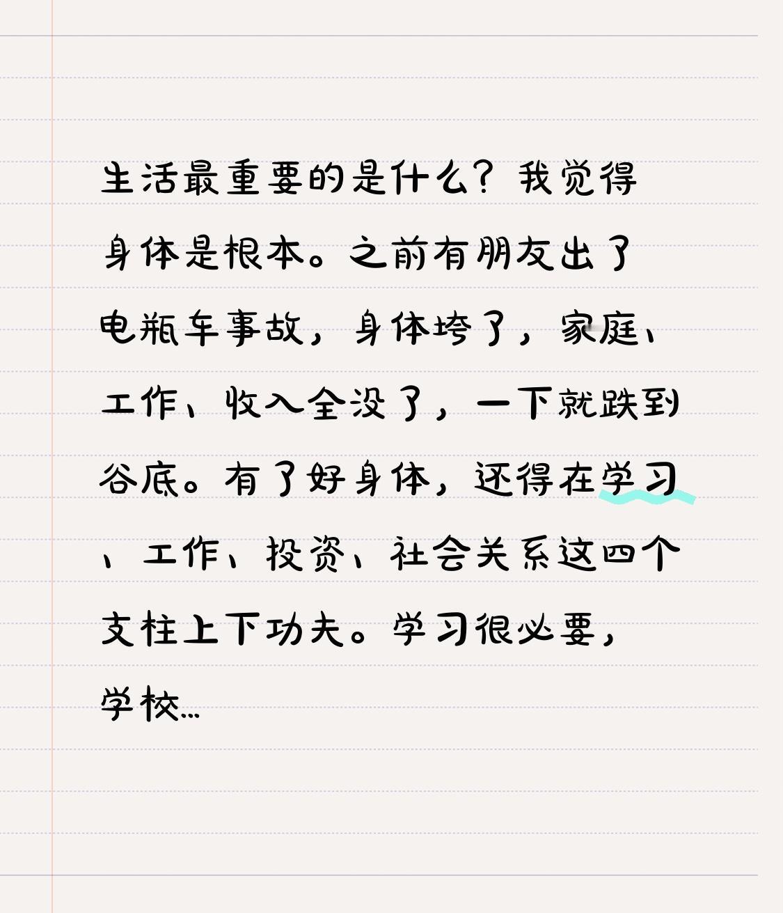 生活最重要的是什么?我觉得身体是根本。之前有朋友出了电瓶车事故,身体垮了,家庭、工作、收入全没了,一下就跌到谷底。有了好身体,还得在学习、工作、投资、社会关系这四个支柱上下功夫。