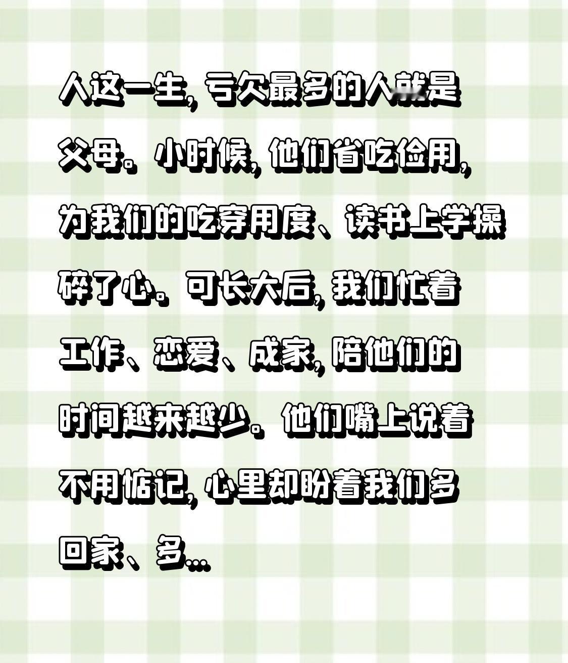 人这一生,亏欠最多的人就是父母。小时候,他们省吃俭用,为我们的吃穿用度、读书上学操碎了心。可长大后,我们忙着工作、恋爱、成家,陪他们的时间越来越少。
