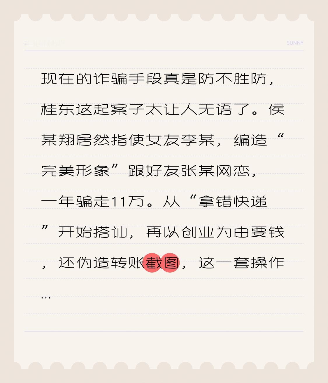 现在的诈骗手段真是防不胜防,桂东这起案子太让人无语了。侯某翔居然指使女友李某,编造“完美形象”跟好友张某网恋,一年骗走11万。从“拿错快递”开始搭讪,再以创业为由要钱,还伪造转账截图,这一套操作下来,张某完全被蒙在鼓里。