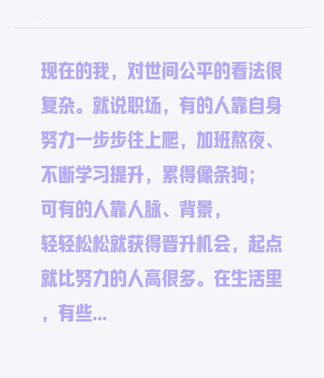 现在的我,对世间公平的看法很复杂。就说职场,有的人靠自身努力一步步往上爬,加班熬夜、不断学习提升,累得像条狗;可有的人靠人脉、背景,轻轻松松就获得晋升机会,起点就比努力的人高很多。