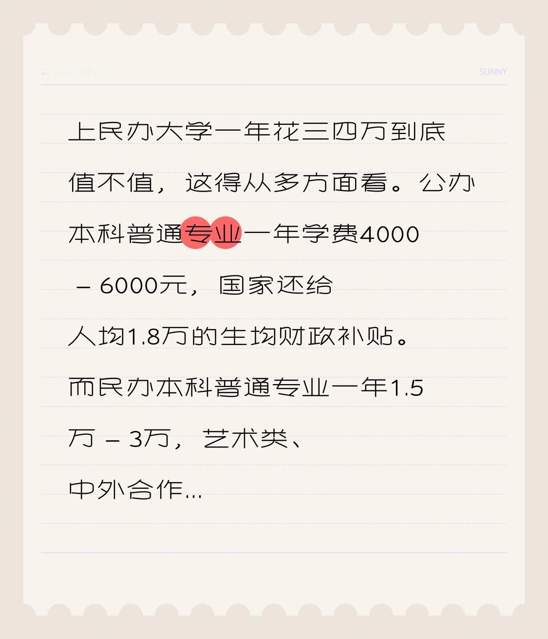 上民办大学一年花三四万到底值不值,这得从多方面看。公办本科普通专业一年学费4000 - 6000元,国家还给人均1.8万的生均财政补贴。而民办本科普通专业一年1.5万 - 3万,艺术类、中外合作专业常达4万 - 5万,浙江、广东等地甚至超5万,且85%经费靠学费。
