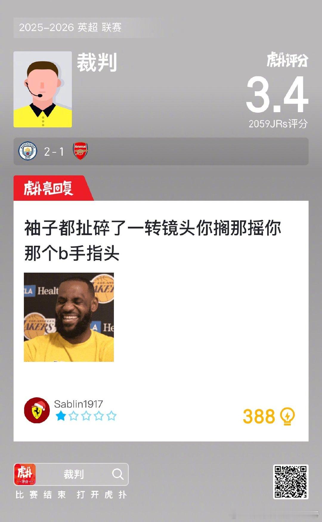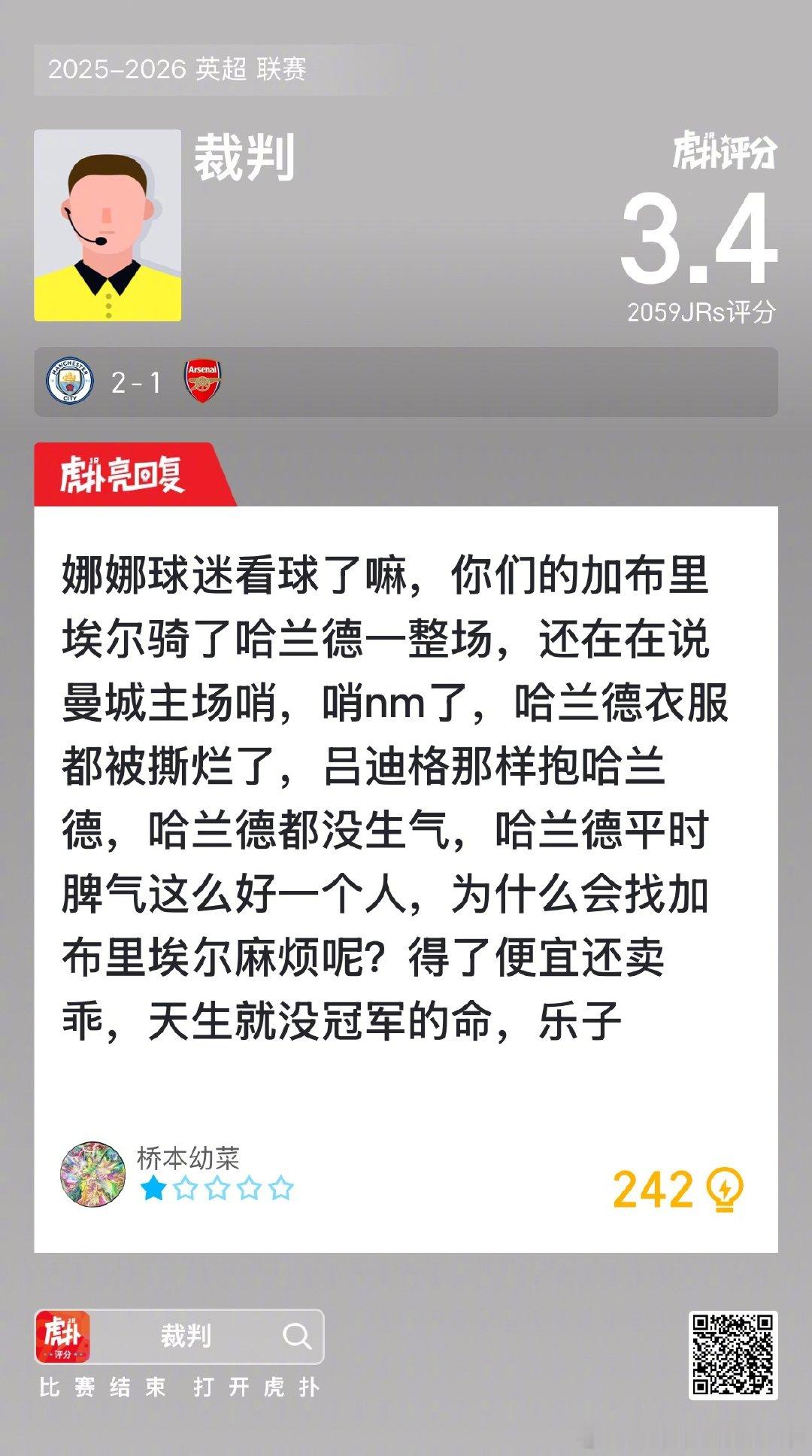 曼城2比1阿森纳你觉得裁判本场判罚是否公平公正? cr:虎扑足球