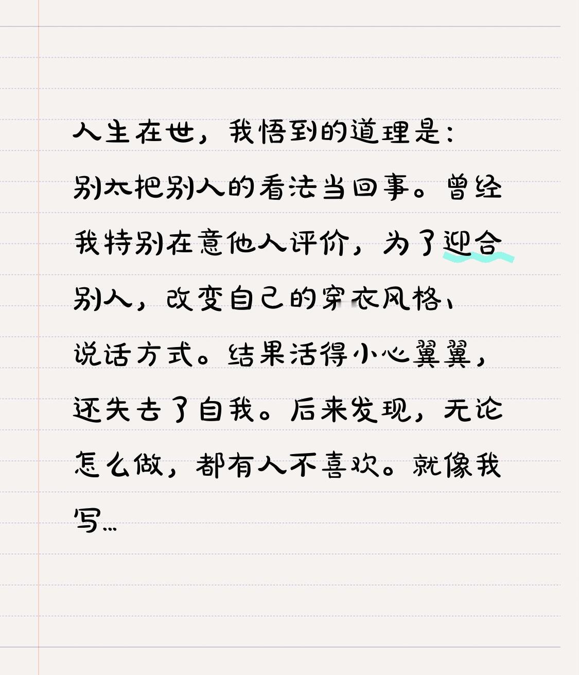 曾经我特别在意他人评价,为了迎合别人,改变自己的穿衣风格、说话方式。结果活得小心翼翼,还失去了自我。后来发现,无论怎么做,都有人不喜欢。