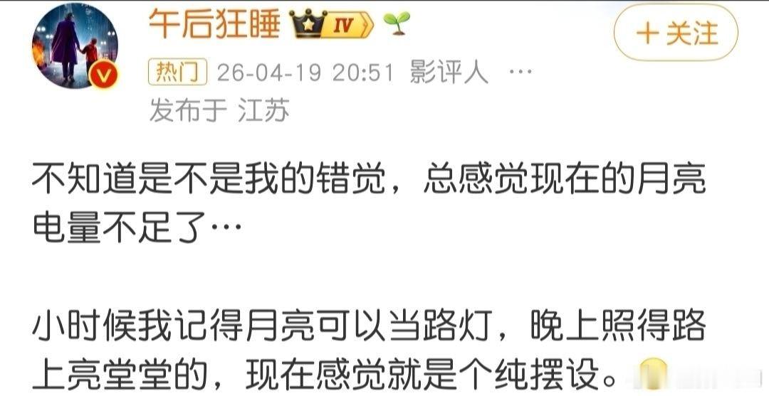总感觉现在的月亮电量不足了月亮没变,气候没变,变得是人的眼睛!小时候没有手机,电视也只能看一会,而现代人真用眼过度了,孩子用平板学习,大人手机不离手,晚上睡前还要刷手机。我觉得就是大家用眼过度了,是咱们眼睛电量🪫 不足了!