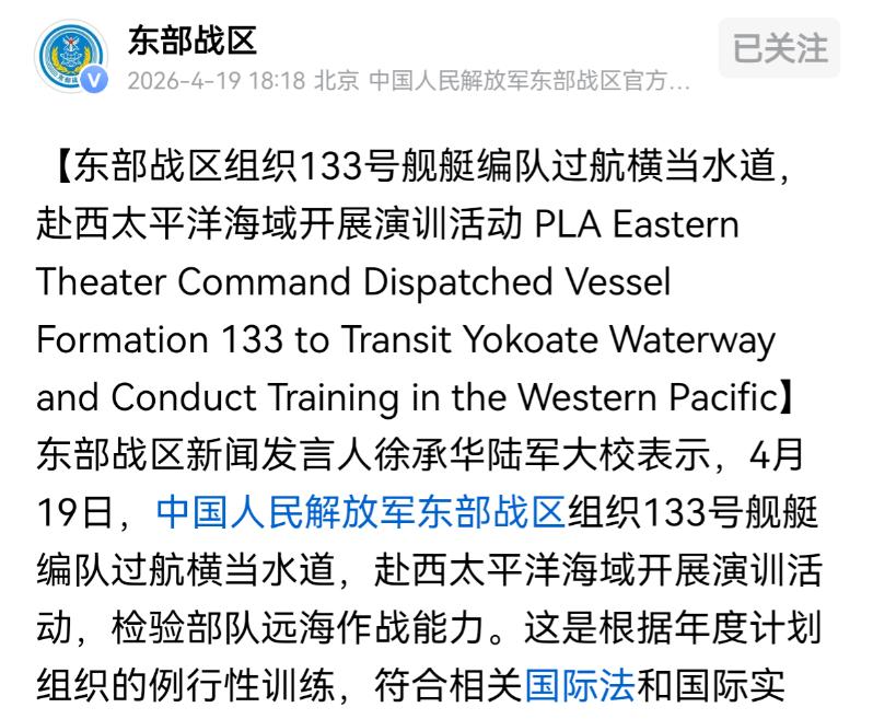 4月19号东部战区突然发布消息,133号052D导弹驱逐舰已经率领水上编队通过了日本西南侧的横当水道。